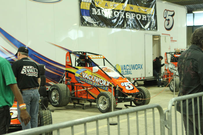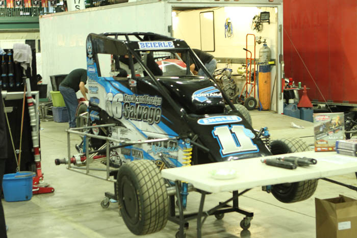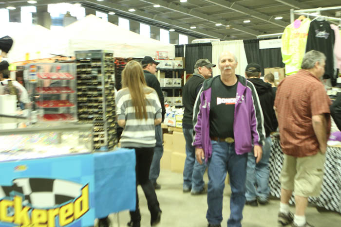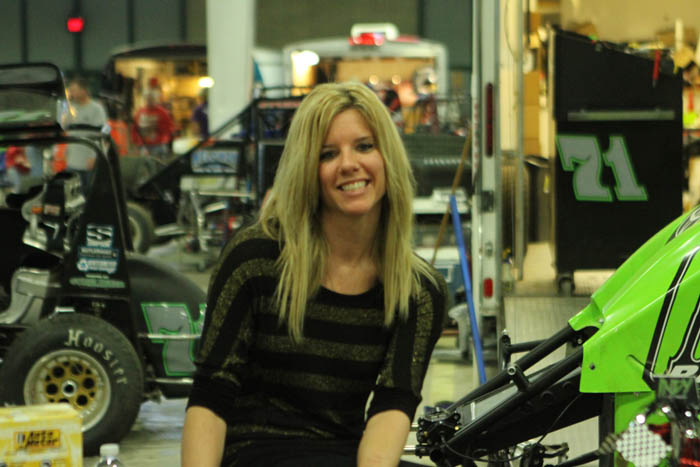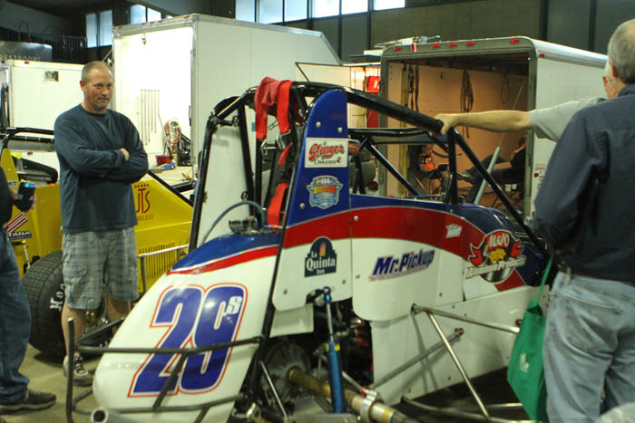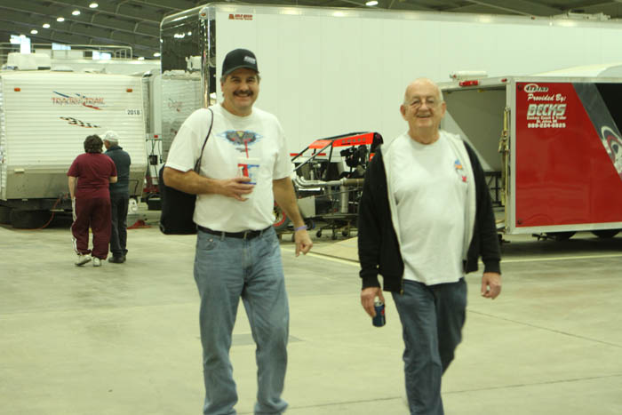 Brad Noffsinger and his wife walk around. He had a bad crash on his qualifier night, but rebuilt the car and came back.