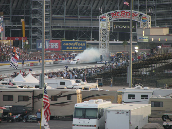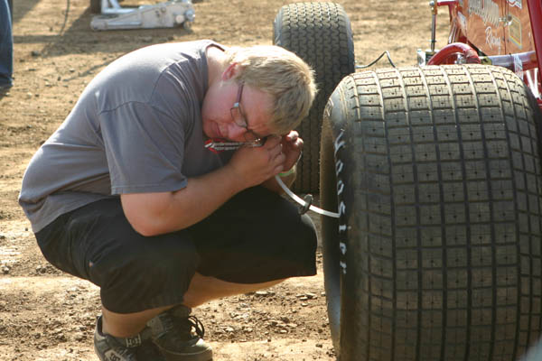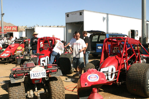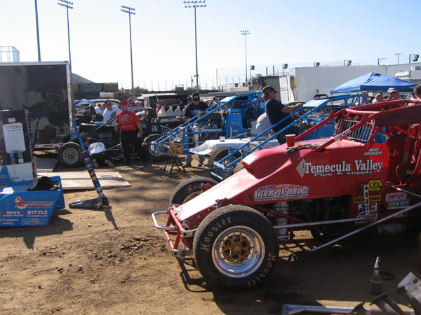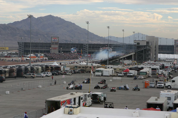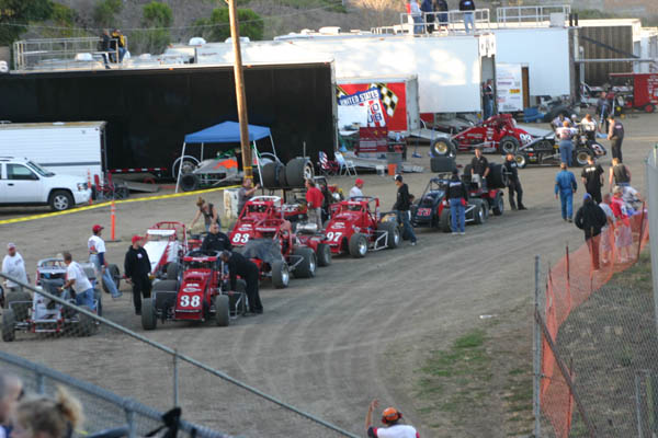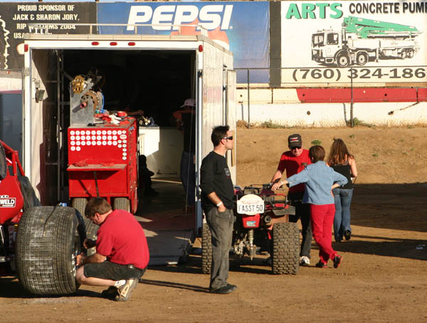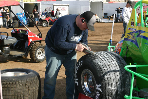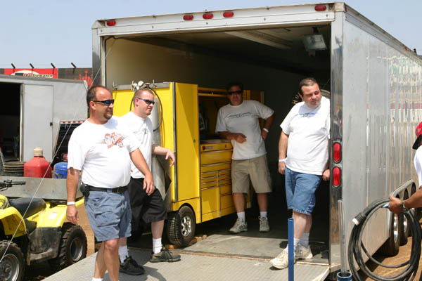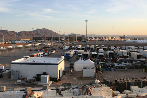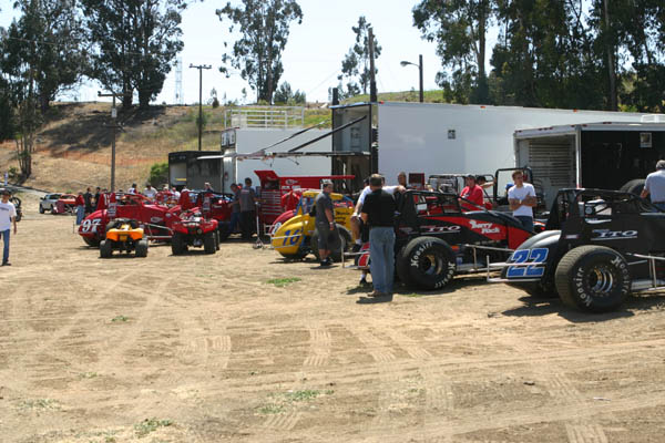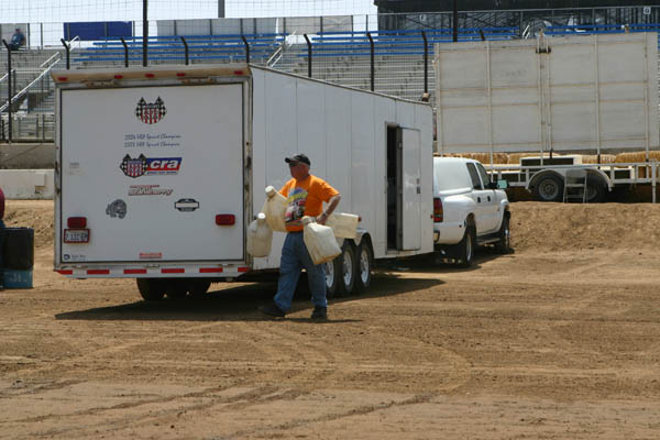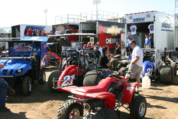 A lot of activity as teams pull in, unload and get to work. Some have to get tires.