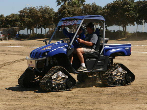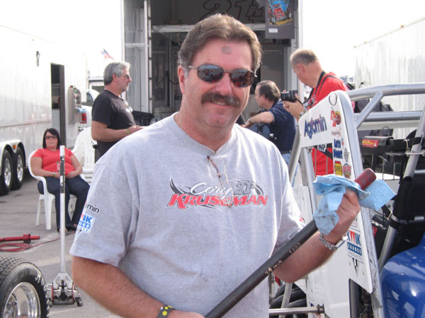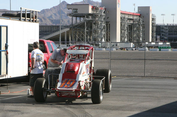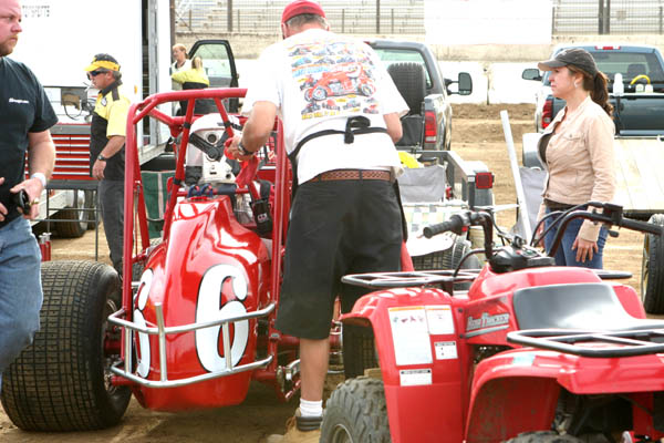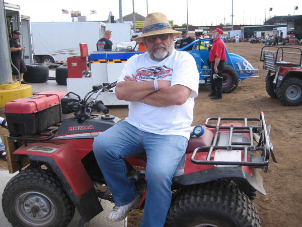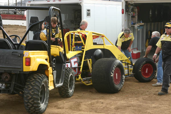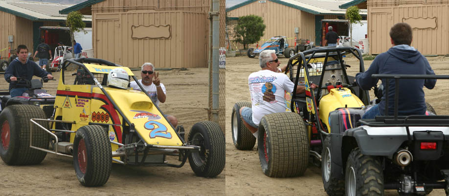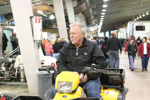Where is the snow? Troy Rutherford's stepfather Frank is just tooling around in the pits in this snow buggy.
