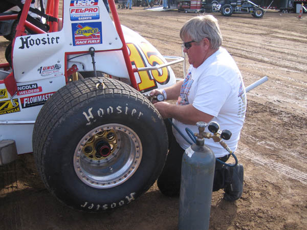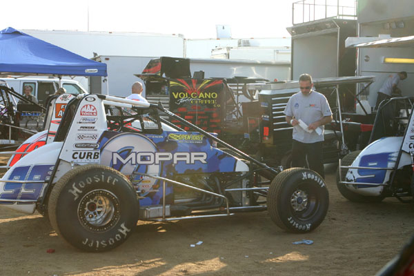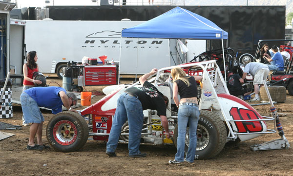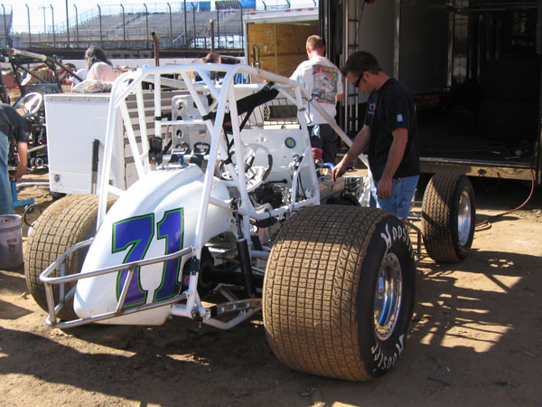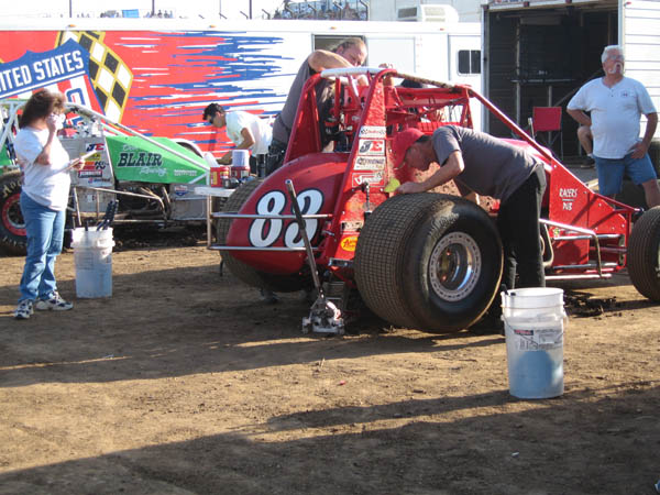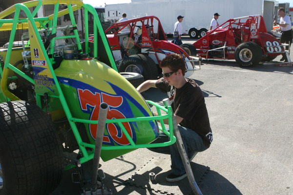 Mike Spencer gets help from one of the young Argo clan, Jake, who once worked on couisin Rodney's car and has gone on to work on Andy Bondio's midget among other top cars.