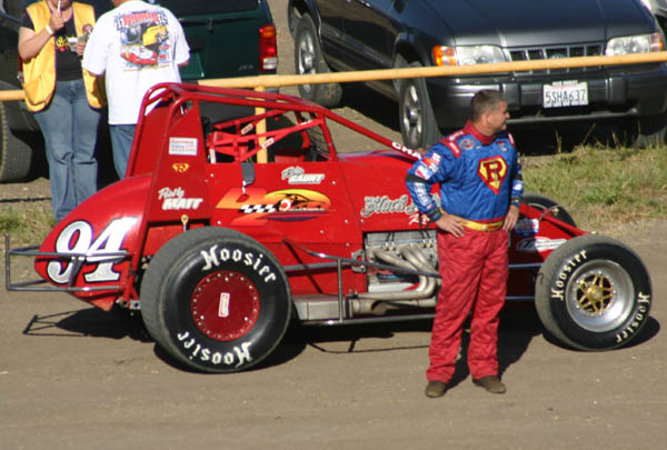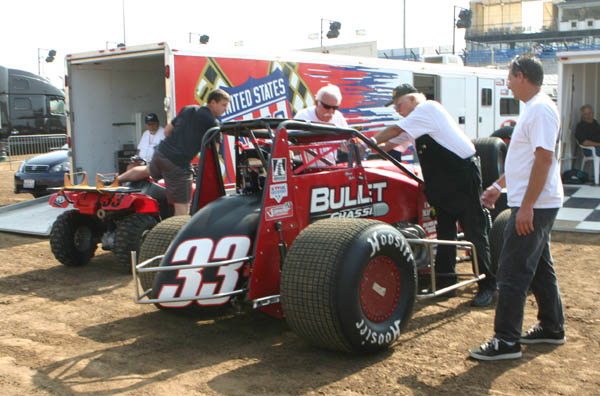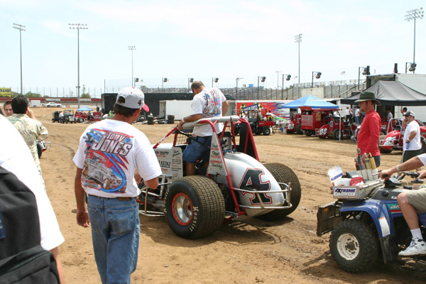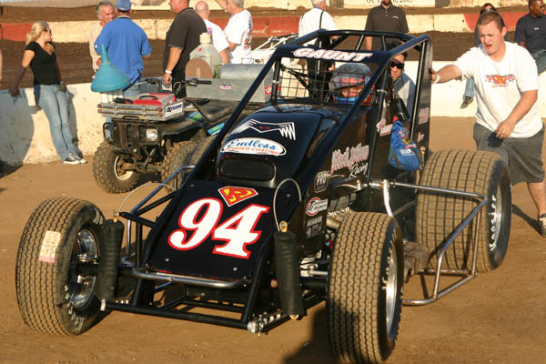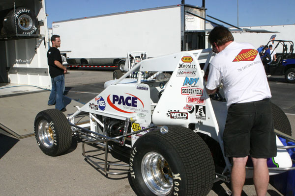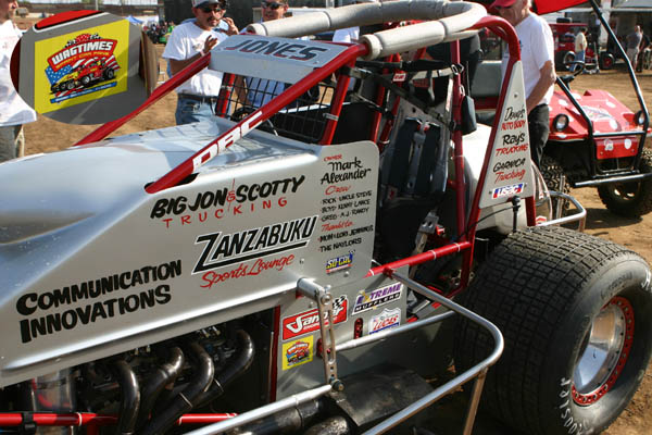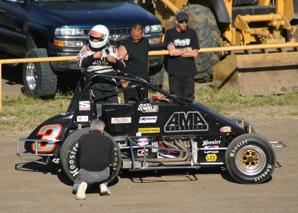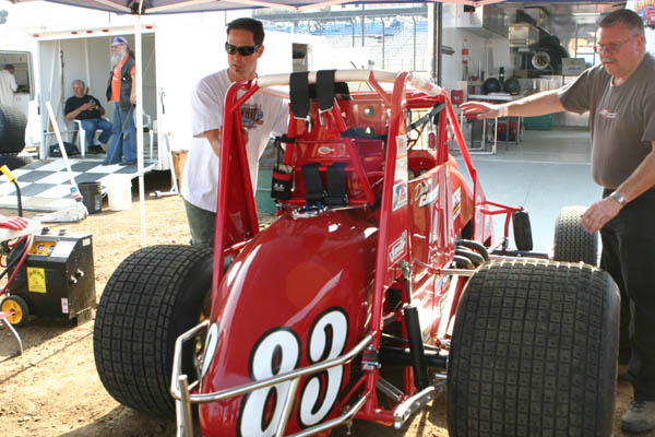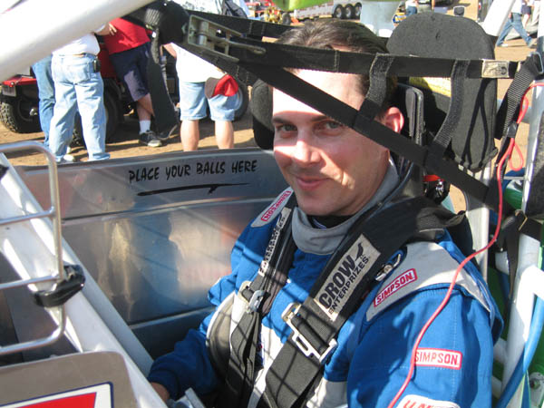 J J Yeley gets fitted into the 2nd Andy Bondio car. J J had a bad heat when he crashed, but came back to get third on his opening A main night and 2nd in the big main. Great job for the NASCAR regular who came from the open wheelers.