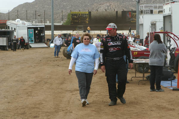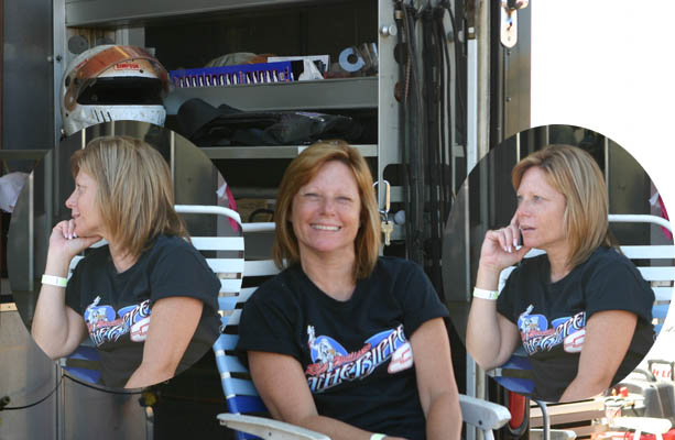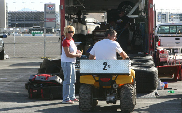 Charlie and wife Gayle in the pits. She told me her work with horses was so much fun.
