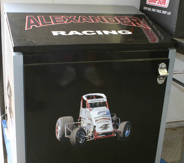 The new cooler for the Alexander team. It's like an old style cooler with a bottle opener mounted on the front. The Alexander logo and race car graphics make this a one of a kind.