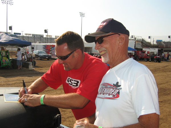 Wags visits with Nelson Stewart, father of Tony, as he came to see some racing and brought the Davey Jones crewed team to run here.