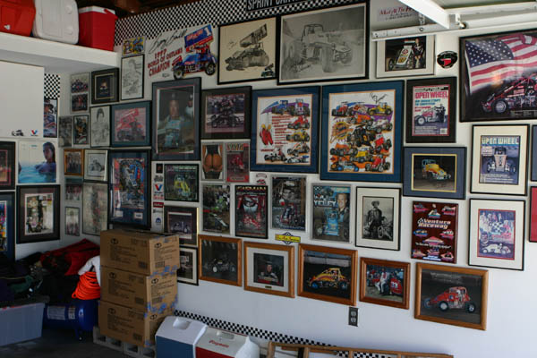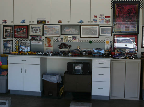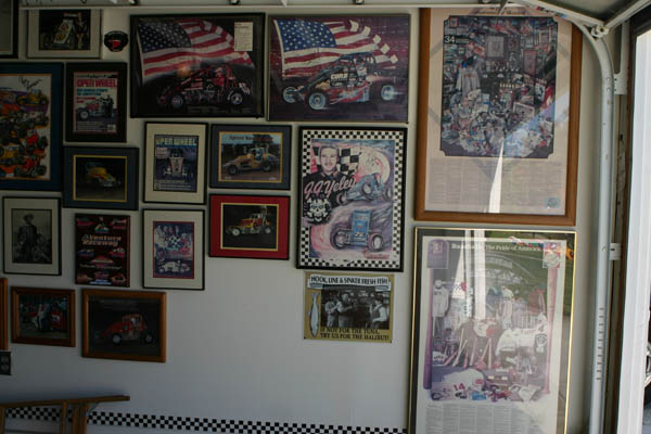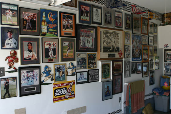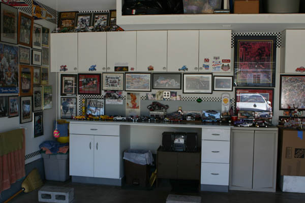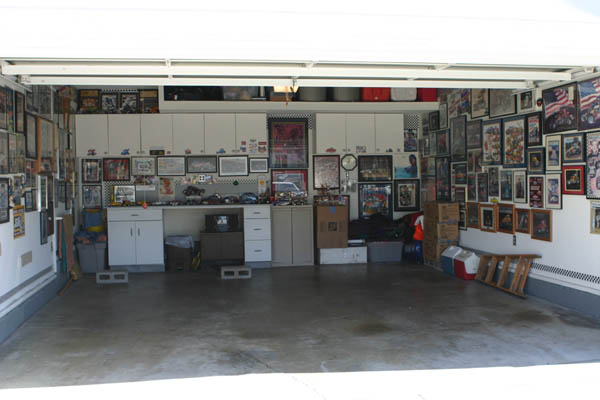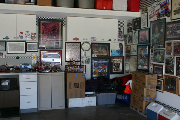 Mike's "den" is out of space, so the overflow goes in the garage. His collection includes racing cars and pictures, sports figurines, and a lot of sports memorabilia.