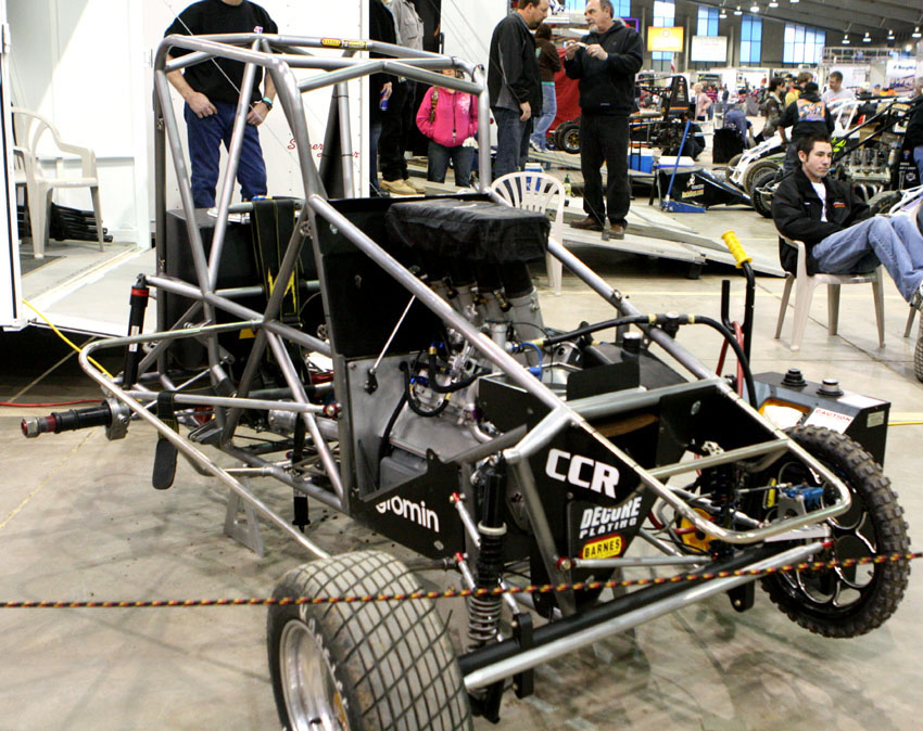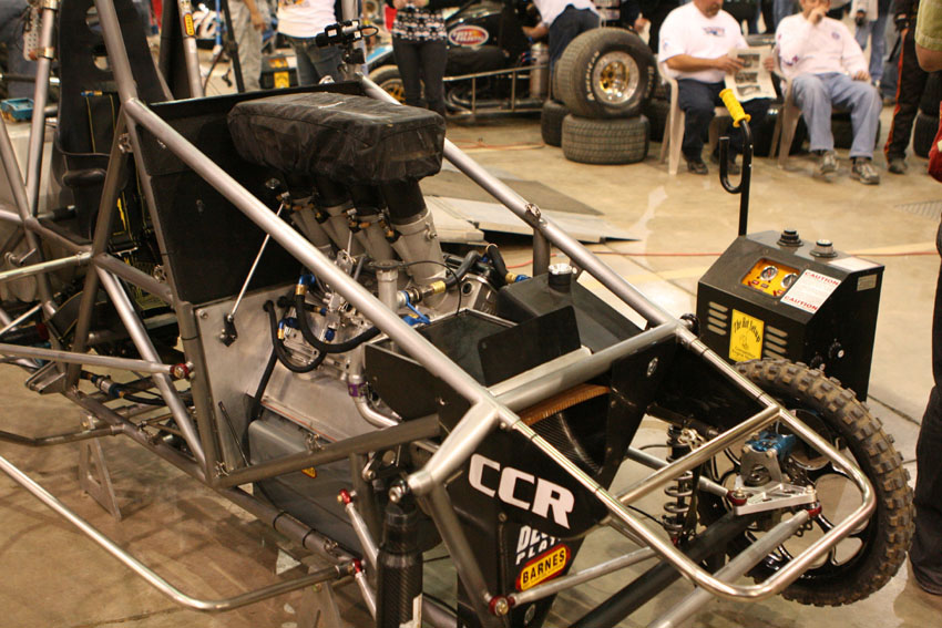 The car up close. Note the motorcycle wheel on front left which saves some weight