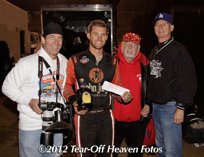 Austin gets hard charger award and a handle of specially labeled Crown Royal from Steve Lafond with Mike Clark and Wags