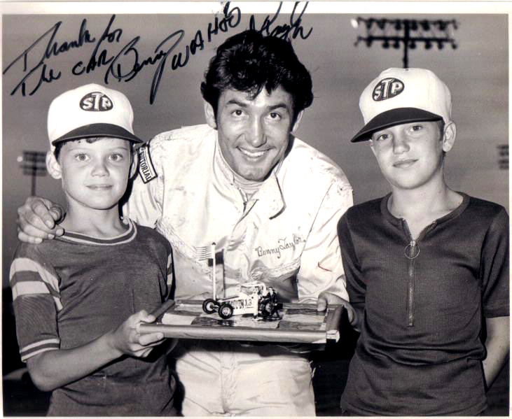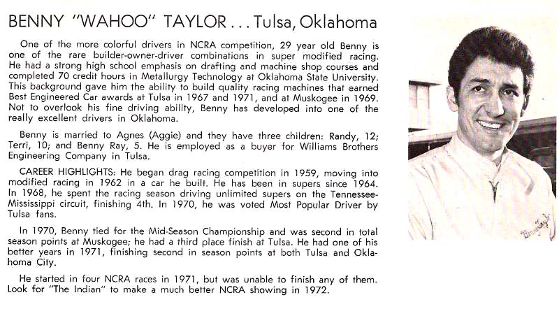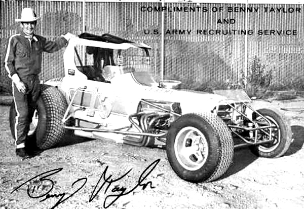 Benny was the first "name" guy I learned about when I moved to Tulsa in 1970 and started going to the dirt track races and watched race cars called Super Modifieds. He was my favorite driver in those days and was fun to watch. As I got into the world of dirt track races there, I soon learned about Benny, Emment Hahn, Harold Leep, Jackie Howerton and a lot of other famous drivers that were there running each week. I quickly learned alot about the midwest drivers from Texas, Kansas and Oklahoma who showed up on Fridays and I fell in love with the Supers. It was cheap to go as the local Get n Go convenience stores had discount tickets for $ 3, so I shopped there every Friday. When I married Mrs Wags and got back to California and went to Ascot, I was preprogrammed to love those sprinters as soon as I saw them. Benny had a lot to do with my loving dirt track racing and then Jimmy Oskie's blue car sucked me in at Ascot and look where that got me! It all makes my head spin because it must have been in the cards to follow that dirt road as I had no idea what was coming. Looking back, I'm pretty happy I got those cards and followed along my path to today.