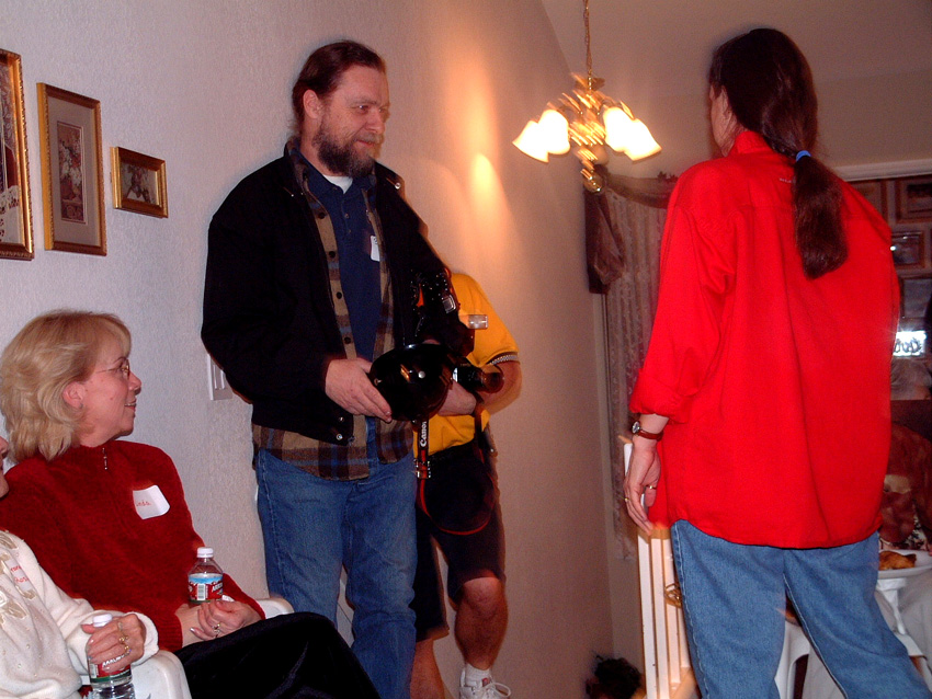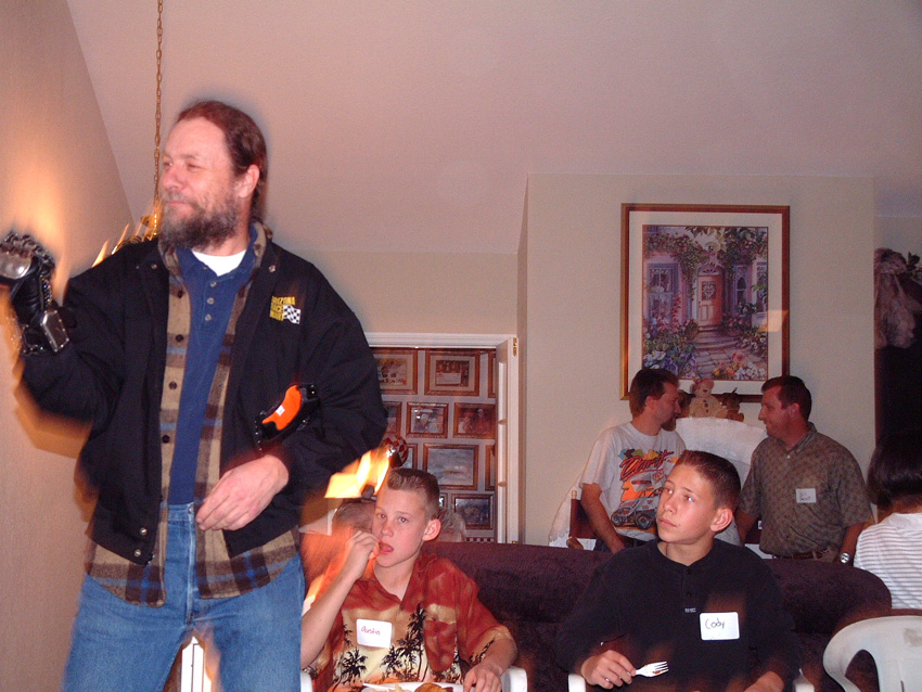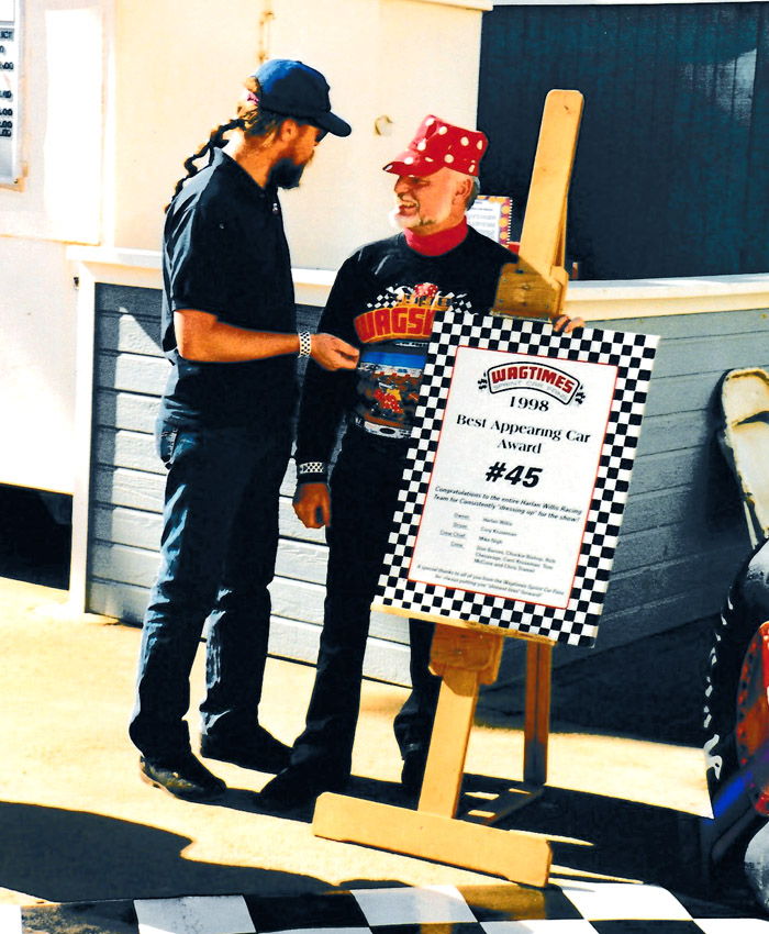 Biker Bruce presenting the Perkins a tire change plaque for winning the silly Wagsdash game