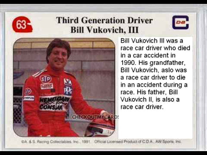 William John Vukovich III (August 31, 1963, Fresno, California, United States – November 25, 1990, Bakersfield, California, United States) was an American race car driver. He was a three-time starter of the Indianapolis 500. The grandson of two-time Indianapolis 500 winner Bill Vukovich and the son of Bill Vukovich II, Vukovich III was the 1988 Indianapolis 500 Rookie of the Year. Billy was killed in a sprint car race at Mesa Marin Raceway in Bakersfield, California, in 1990.