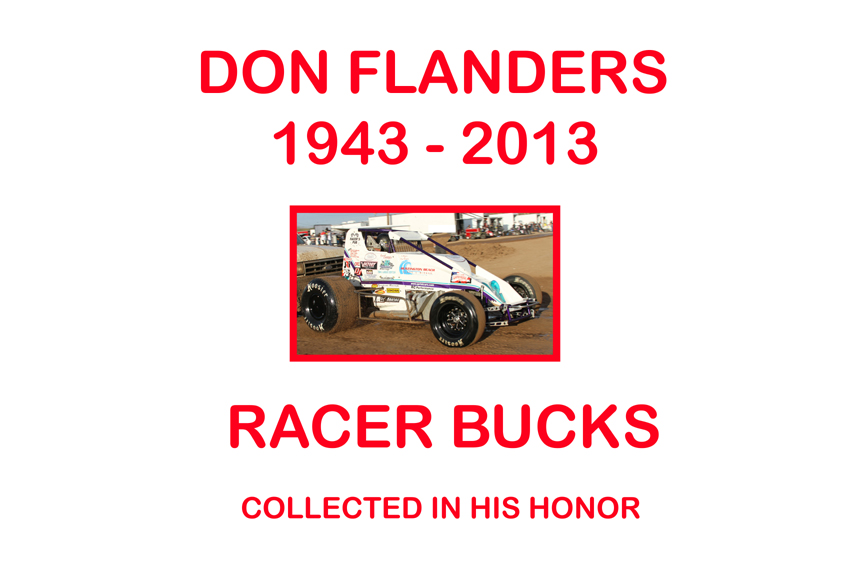 Don Flanders was one of the most enthusiastic race people I have ever known. Back in the day of the 911 sprint car, he was excited about the performace of the car and we got to know each other during the racing times for it. One weekend I, along with alot of others, were invited down to San Diego for a little play day. He and Rich Bucheit (SP) had a hand in it that day and I remember we had to move locations once because of the law, so they drove the car on the streets to our next "race track" parking lot, before I got my turn. When it came, I buckled in and was having a ball going at least 200 miles an hour (maybe 25) around the little paved area marked off by pylons. I remember that day and especially the moment when I thought I broke the motor! I am flying along in pure bliss when suddenly the car went fat and powered down like it was hurt, so I pulled in. Everyone was laughing when I appologized and they showed me the RC controller! That's how they let you know you your ride was done, how was I supposed to know? That day forever sticks in my mind as stupendous, just to get a chance to floor a real sprint car. I later got track packing time in Tom Downing's car at Bakersfield on my 50th birthday, but it wasn't the same.