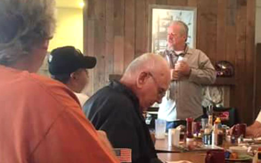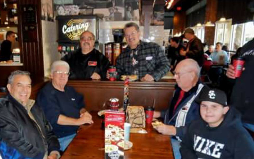 Reyes blows his two-tone Helms whistle to start the meeting. He welcomes "the girls" — a booth full of wives — and asks everyone to support the group by buying tickets for the weekly 50-50 raffle (in which they could win one of his wife Sandy's pineapple upside-down cakes).