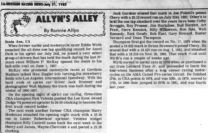 Eddie was the 1985 CRA champion and won 33 CRA events over his career. He had 32 lifetime fast times and 32 Trophy Dash wins. He started in flat track motorcycles and I heard he was awesome. He was always good with the fans and had time for them. He was the Wagtimes 2002 Grand Marshal and it was fun watching him race the bombers with the rest of the Legends. He still comes around the races. I remember him bringing Paul Newman to Ascot where Paul was amazingly fast in a sprint car. Eddie is a true legend in racing. Even today he is very friendly when he comes to the races. What a smile!