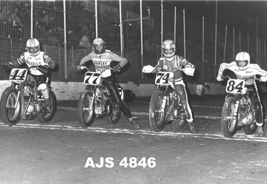Alex Jorgensen Norton # 44, Eddie Harley Davidson # 77, Steve Eckland Yamaha # 74z and Walt Foster Triumph # 84 - Ascot TrophY Dash