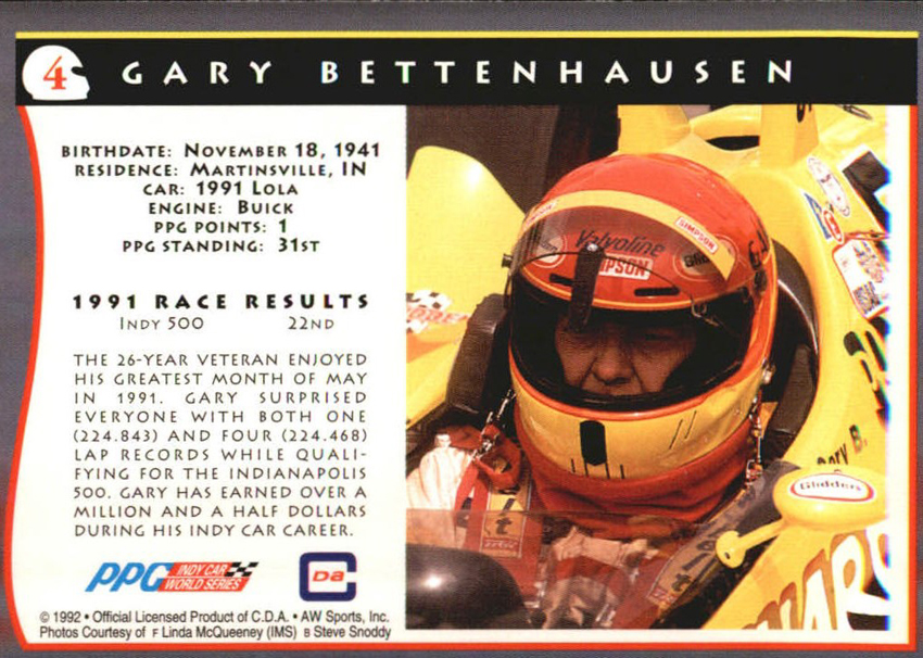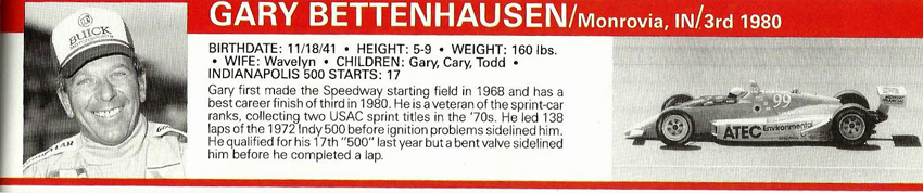 Bettenhausen competed in Champ/Indy style cars from the mid-1960s until 1996. During this time he won six USAC Indy Car races. He made 21 starts in the Indianapolis 500, contesting each event from 1968 until 1982 (with the exception of 1979 when he failed to qualify), and again from 1986 to 1993.[2] His best finish came in 1980 when he finished third after starting 32nd in the 33-car field.
