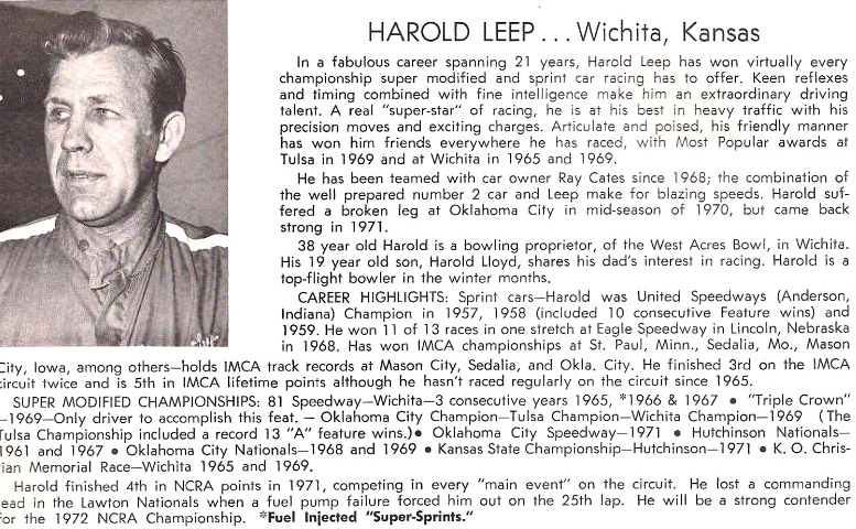 The 1964 season was another big one for Harold as he finished 4th in IMCA points and added 5 more wins to his IMCA resume. By the 1965 season Harold had decided to cut back on his sprint car activities. This was good news for fellow IMCA competitors as Leep was 4th in points for the IMCA decade 1955-64, trailing only Pete Folse, Bobby Grim and Buzz Barton.