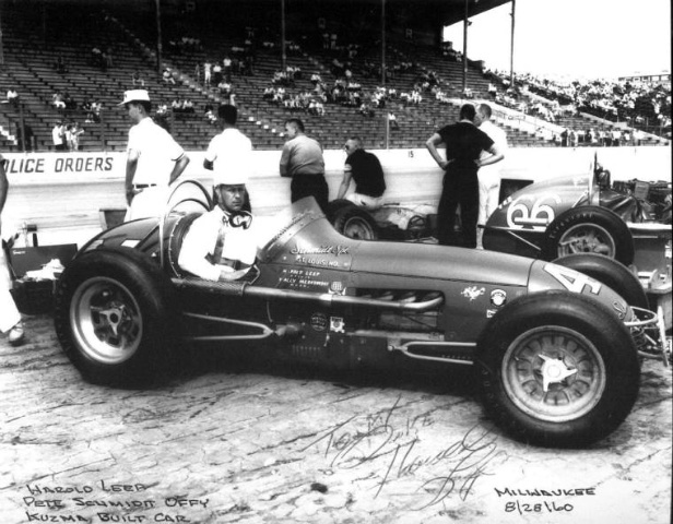 In 1957-58-59, Leep and Wilson won the United Speedways Championship three straight years, once winning 10 races in a row before they lost. In the IMCA ranks Harold finished third place in 1959, 9th in 1960 and third in 1961. In 1960 Harold crossed over to the USAC ranks and raced for Peter Schmidt in his championship car wrenche3d by legendary mechanic Wally Meskowski. Unfortunately for Leep this endeavor led to only one start, a 14th place finish at Syracuse, New York. Though Leep would never end up racing at Indy, USAC’s loss was the heartlands gain as Leep would dominate in the midlands for years to come.
