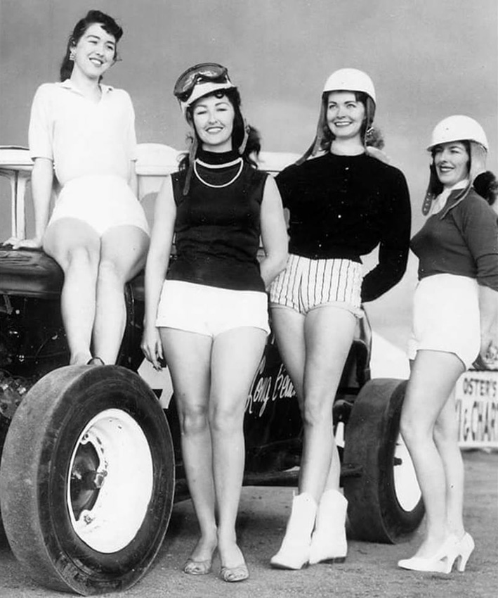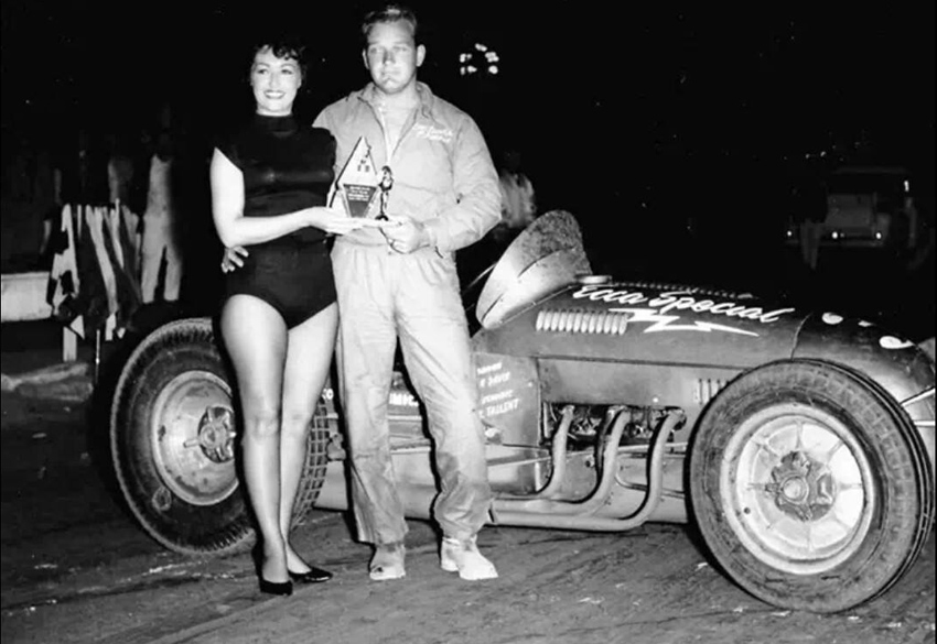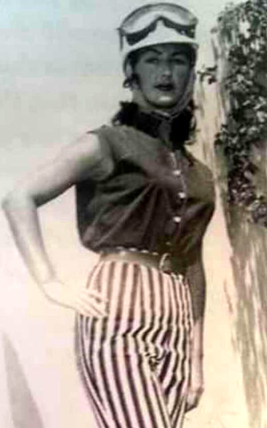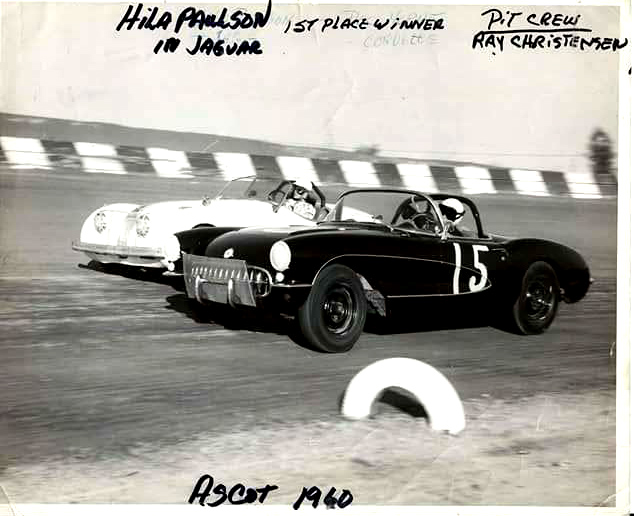 Hila in white Jaguar outside # 15 at Ascot 1960