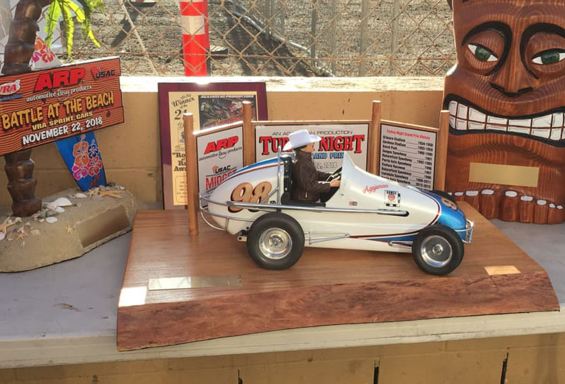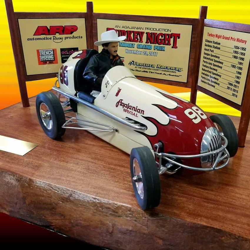 A lot of the veteran promoter’s time is taken up making trophies that are literally works of art. Since the Turkey Night Grand Prix came back to the track in 2016, he has handmade sensational 1/6-scale trophies. They take ten months to build. Each features J.C. Agajanian Sr. behind the wheel of a famous race car, and there is a story behind that.