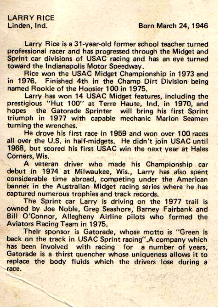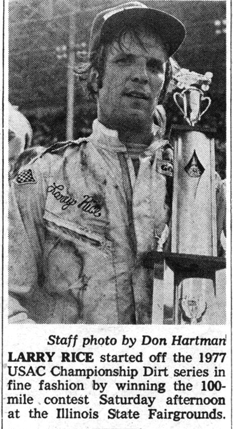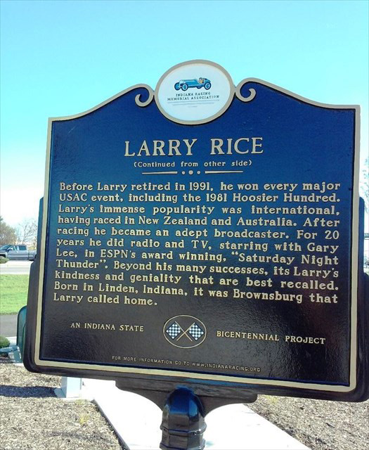 Larry Rice (24 March 1946 – 20 May 2009) was an American racing driver in the USAC and CART Championship Car series.[1] He was the 1973 USAC National midget driver's champion[2] and won the USAC Silver Crown series in 1977 and 1981.[3] He was inducted in the National Midget Auto Racing Hall of Fame in 1993
