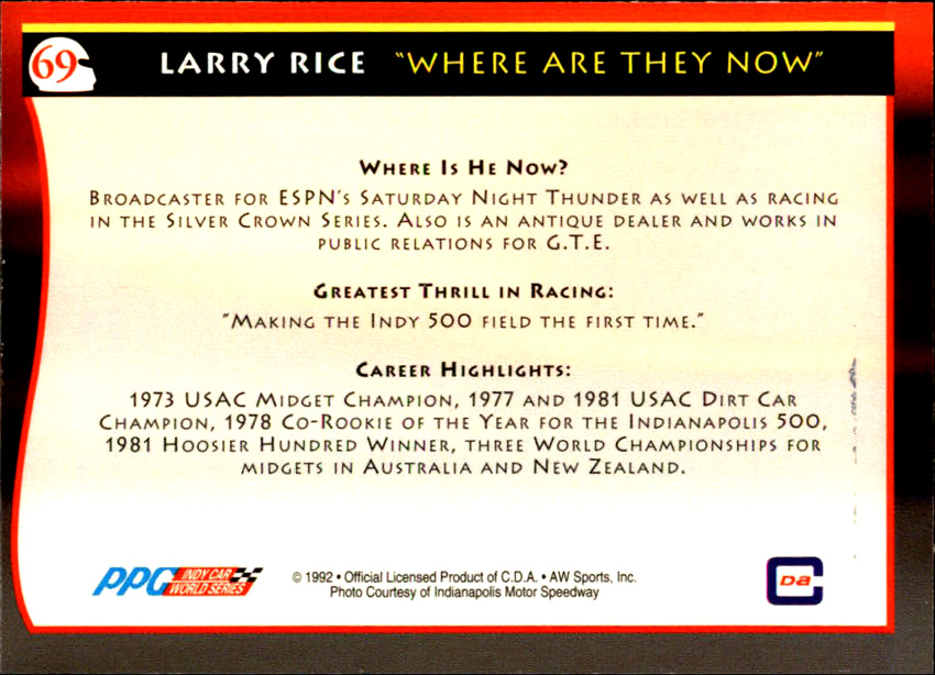 Rice had a major win when he won the 1970 Hut Hundred. Rice finished third in 1972 USAC National Midget championship, helping his team (Shannon Brothers) win the owner's championship.[2] Rice followed up by winning the 1973 USAC National midget driver's championship himself.[2] Rice was also the 1977 and 1981 USAC Silver Crown Series champion. He won the Silver Crown and sprint car portions of the 4 Crown Nationals at Eldora Speedway in 1985. He won his second Silver Crown portion at Eldora in 1987.