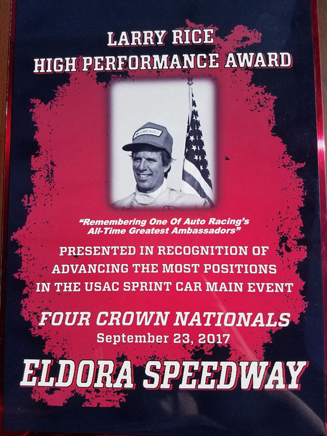Larry's High Performance Award at Eldora's 4 Crown in Sept 2017