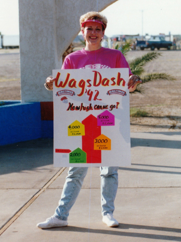 Mrs Wags advertising the 92' Wagsdash at Manzy
