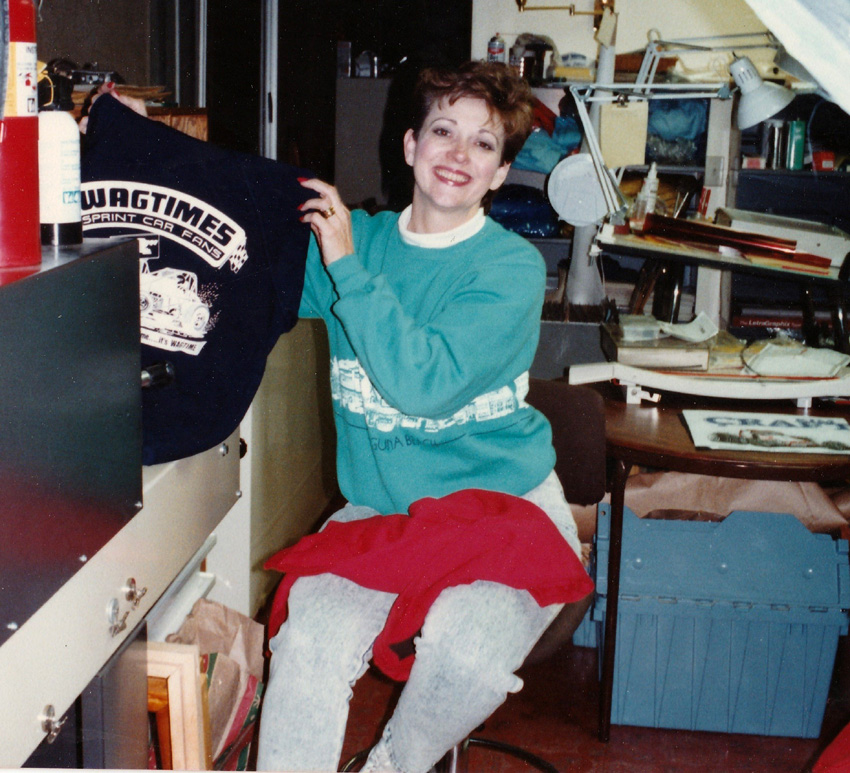 Mrs Wags holds up the first black Wagtimes shirt at the cap Doc's shop
