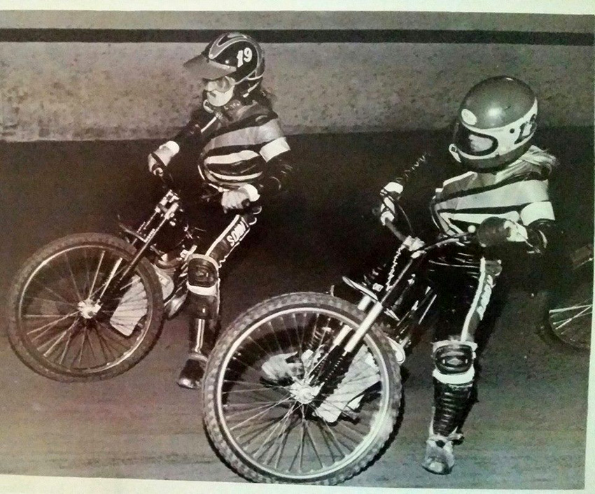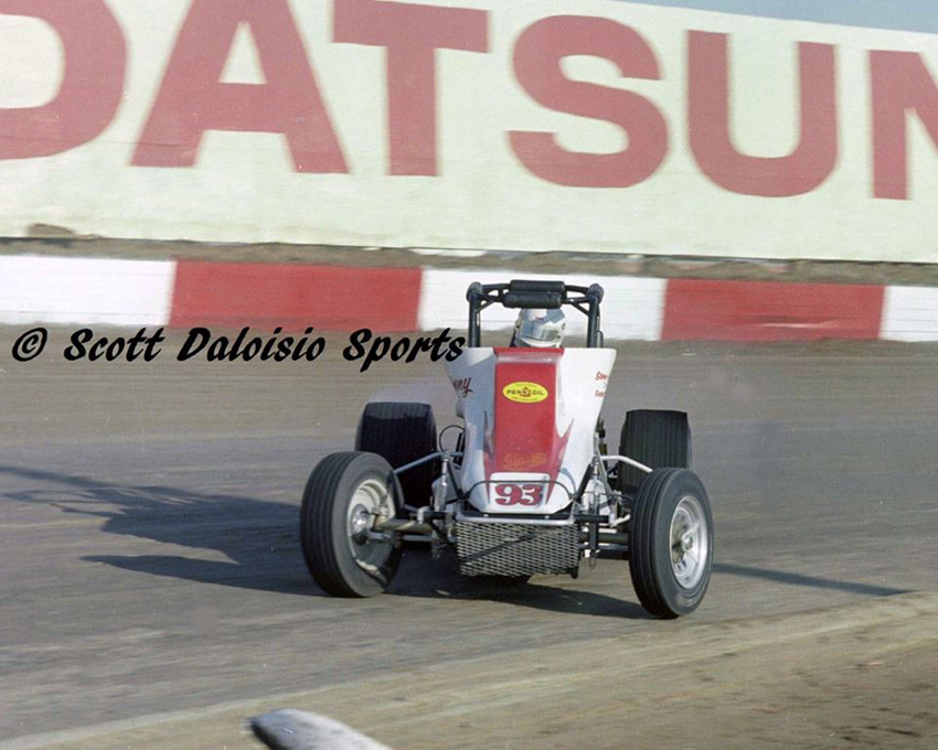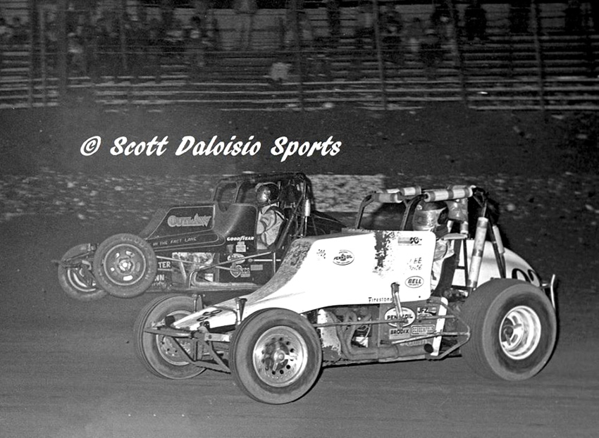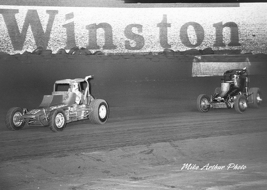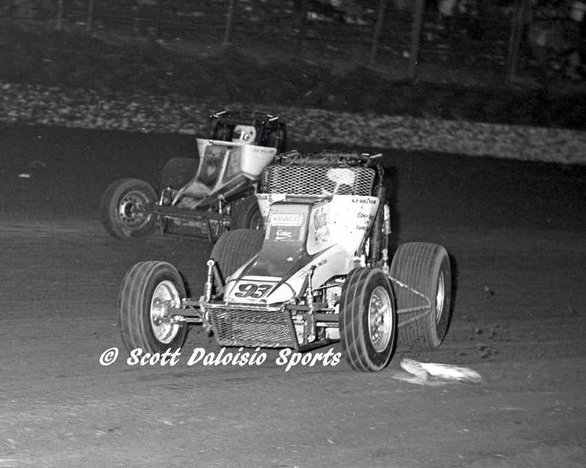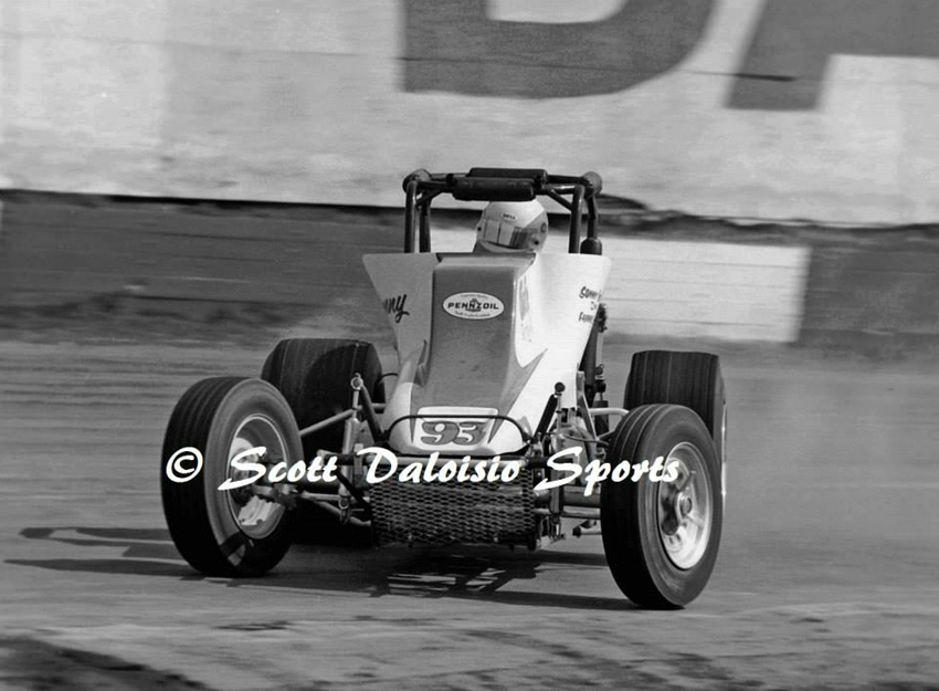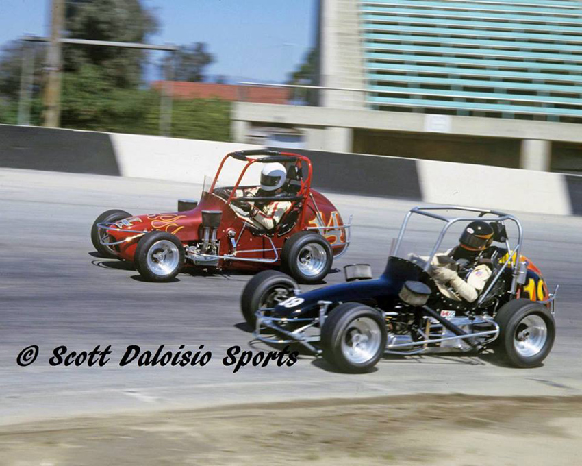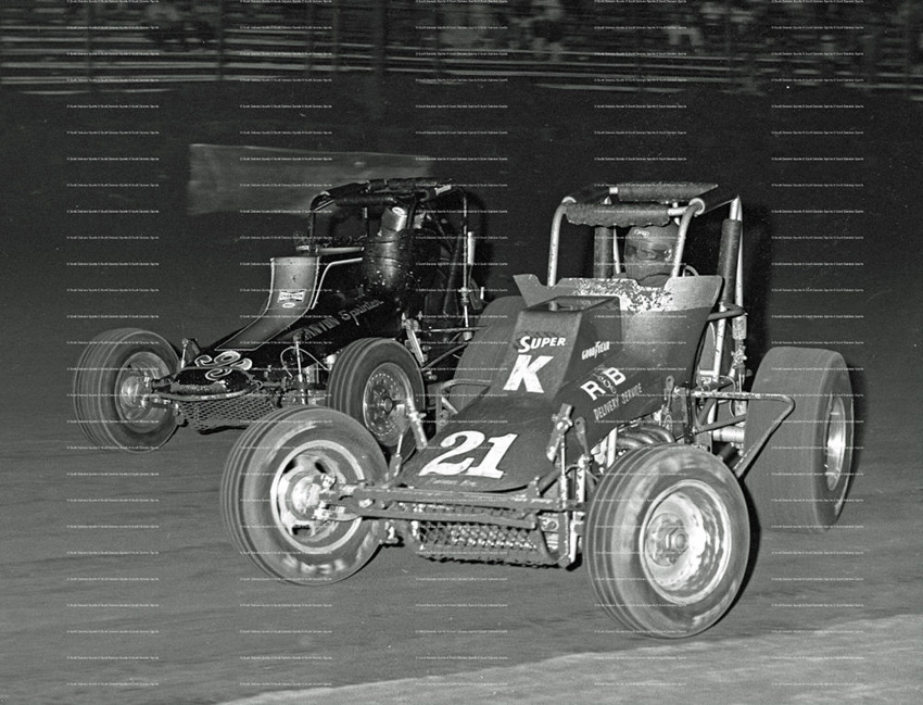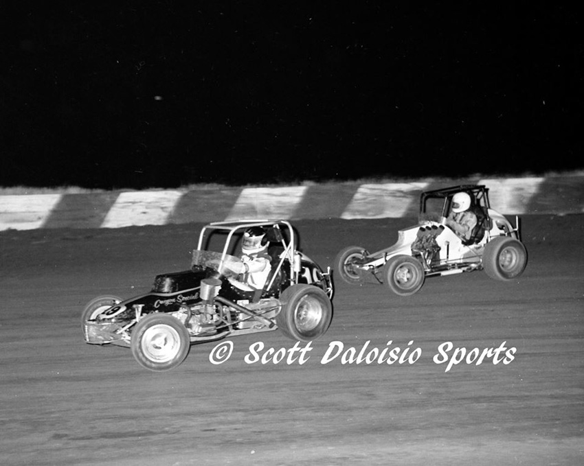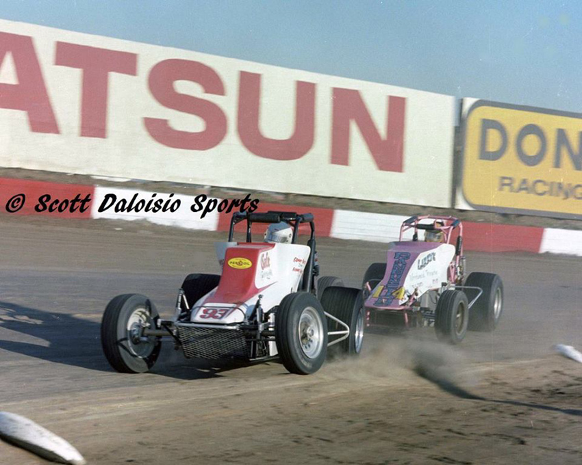 Sonny climbing on the back of Tommy White in the Ascot Super Midgets in August of 1980