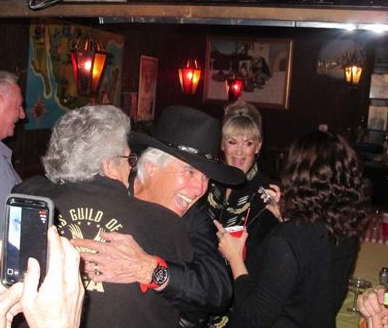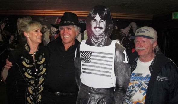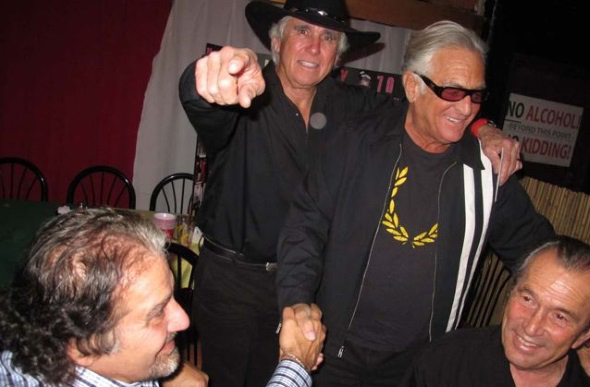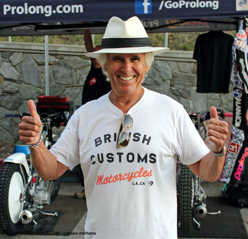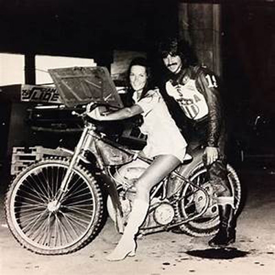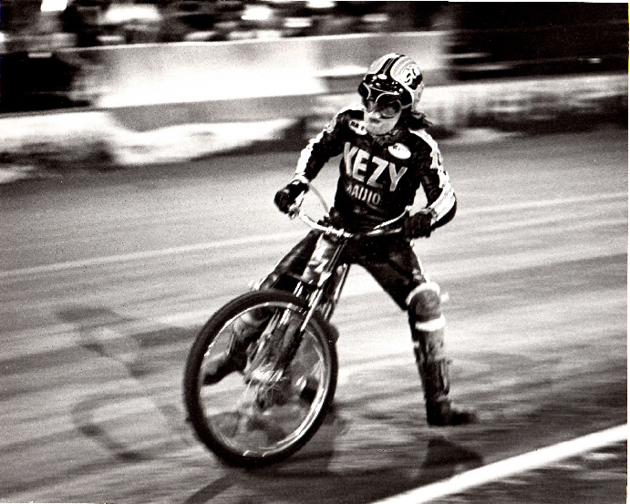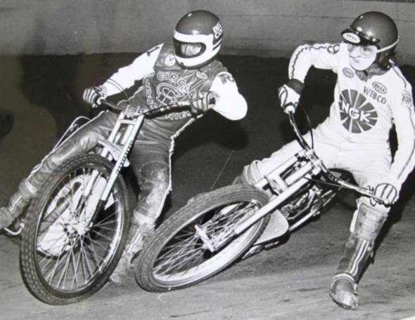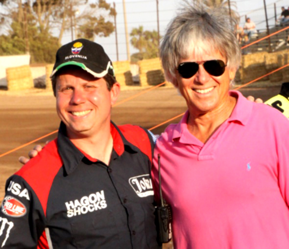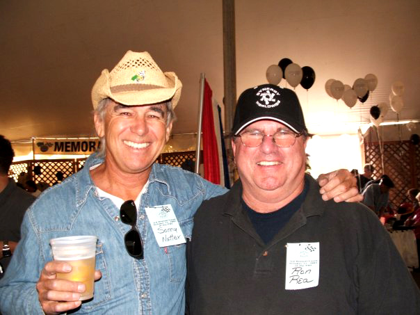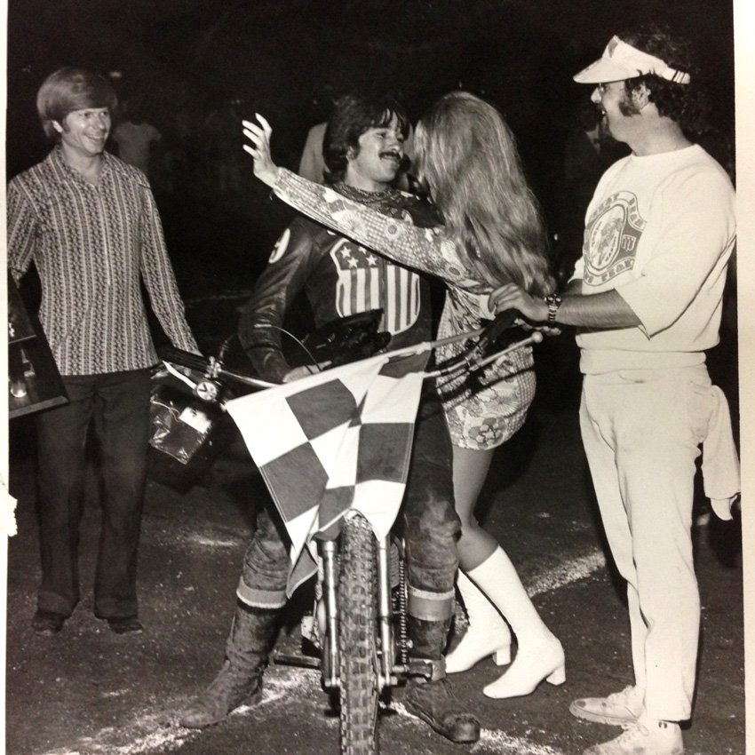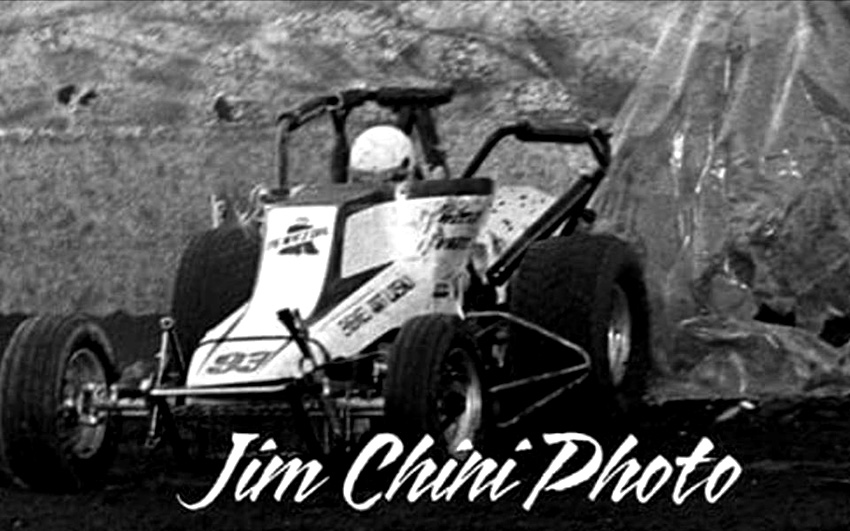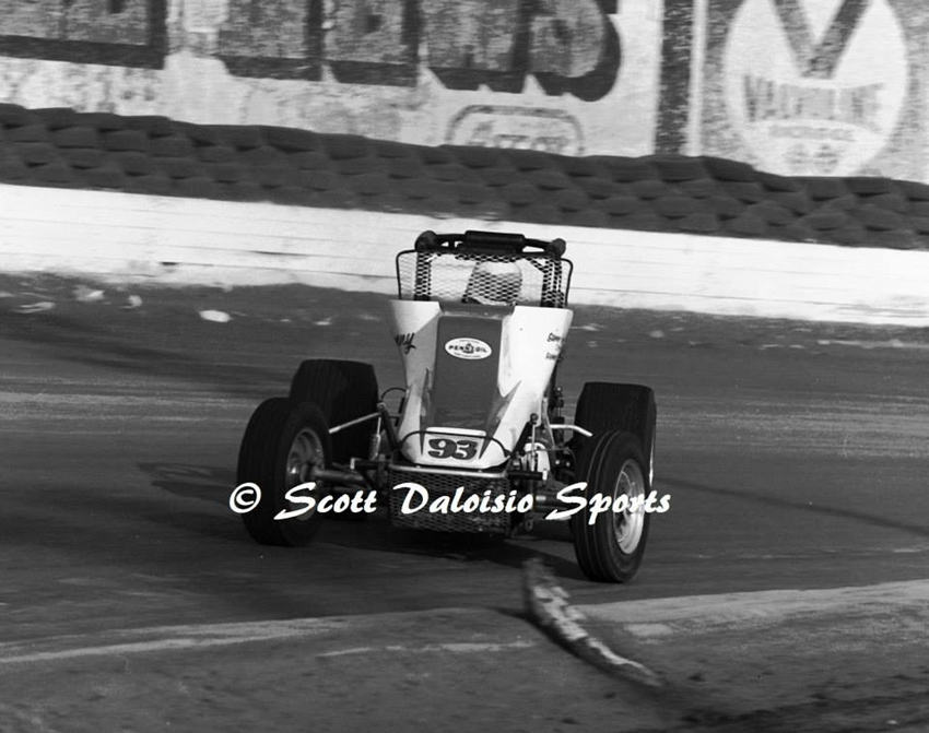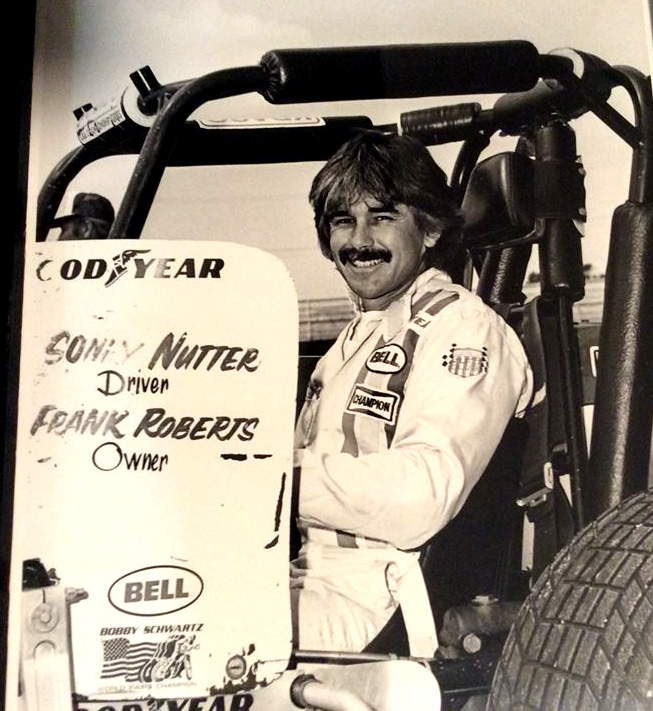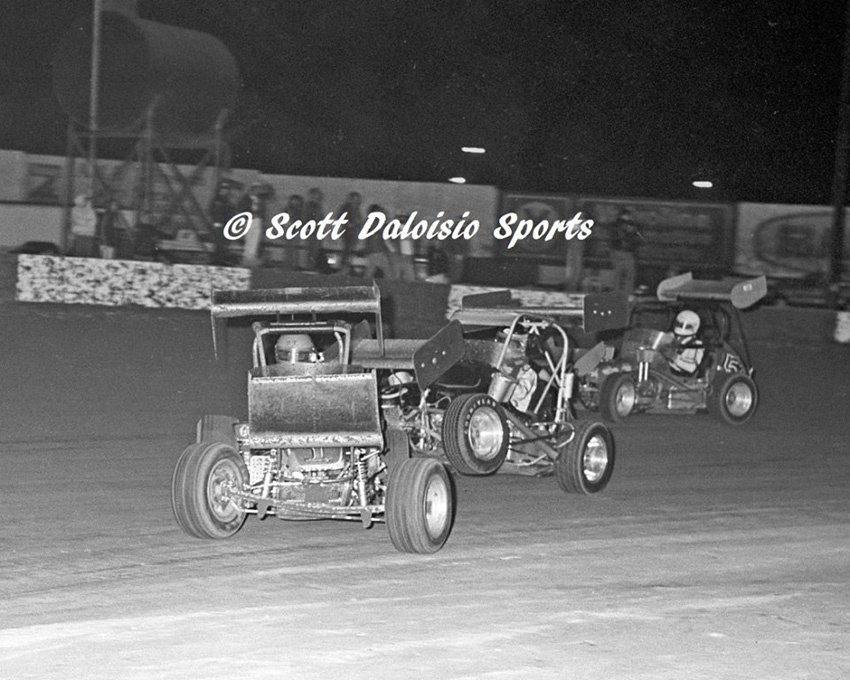 Sonny climbing on the back of Tommy White in the Ascot Super Midgets in August of 1980