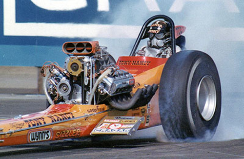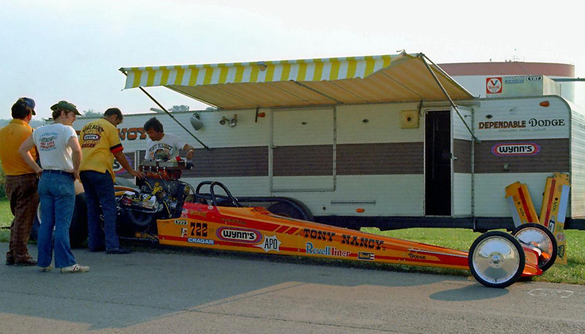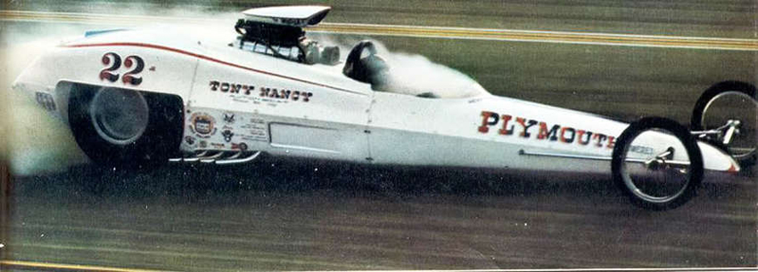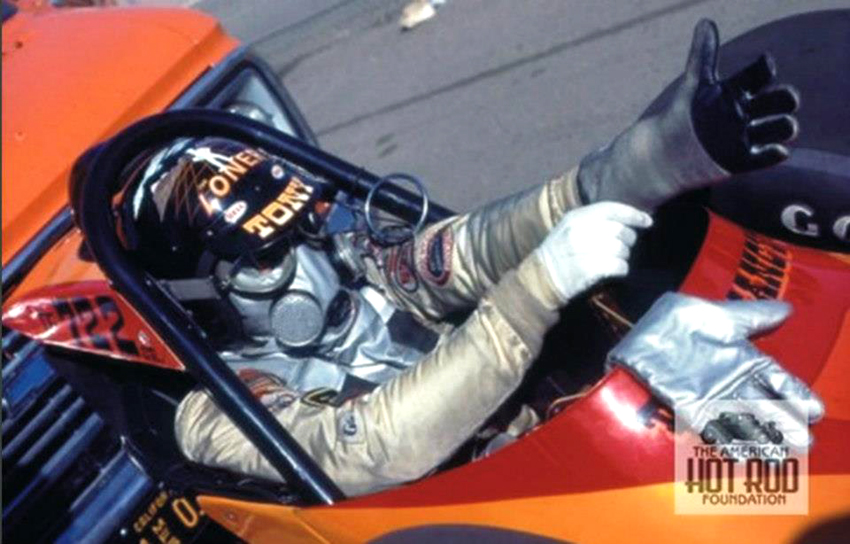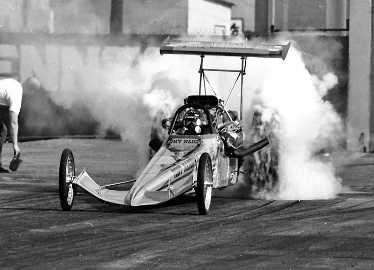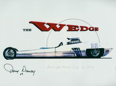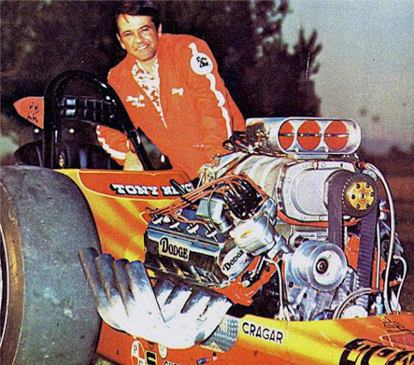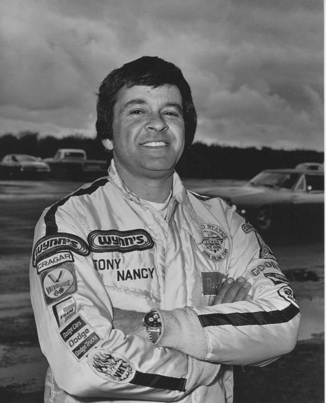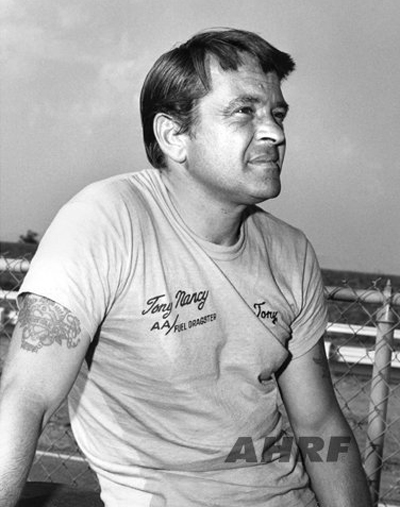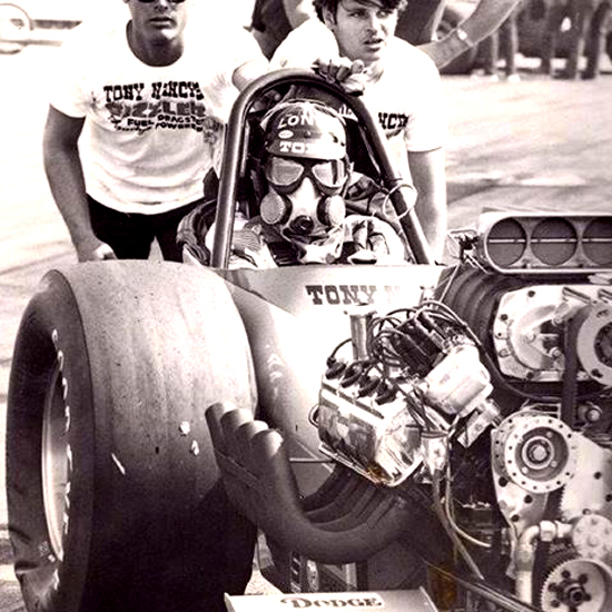They called him "The Loner" because he could literally field a car by himself. He always wanted to go faster, and if that required an unconventional approach, he never hesitated. Tony was one of the pioneers in rear-engined dragsters with his Wedge and Wedge II AA/GD fully enclosed rails built between 1963-1965. Built by Frank Huszar and Roy Steen, to automotive artist Steve Swaja's design, the first Max Wedge ran a 482-cu.in. Plymouth and turned 187.00 mph. Tony totaled that car in Sandusky, Ohio, in the summer of 1963. Its replacement, better known as the hemi-Wedge, ran a 426 Hemi on gas, turning times in the low 8s with speeds approaching 190 mph. The restored Wedge II has been on display at the NHRA Museum in Pomona.