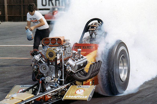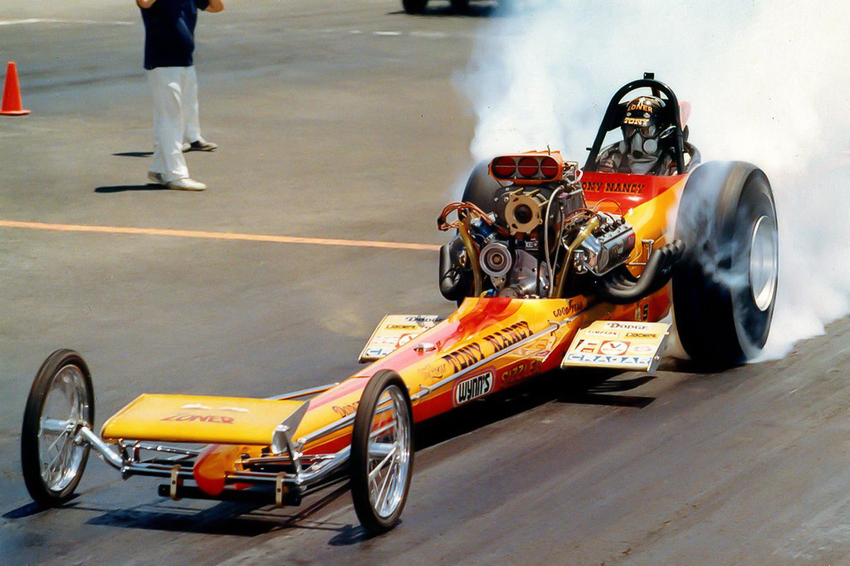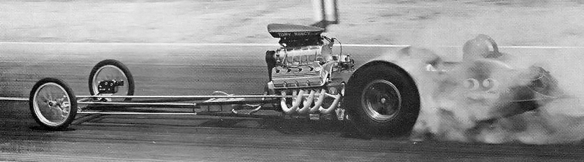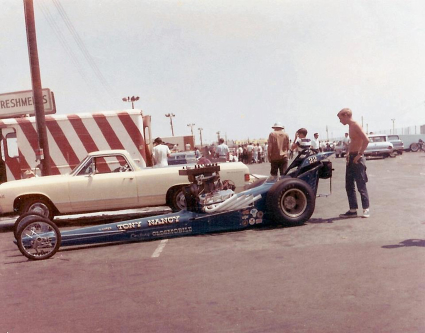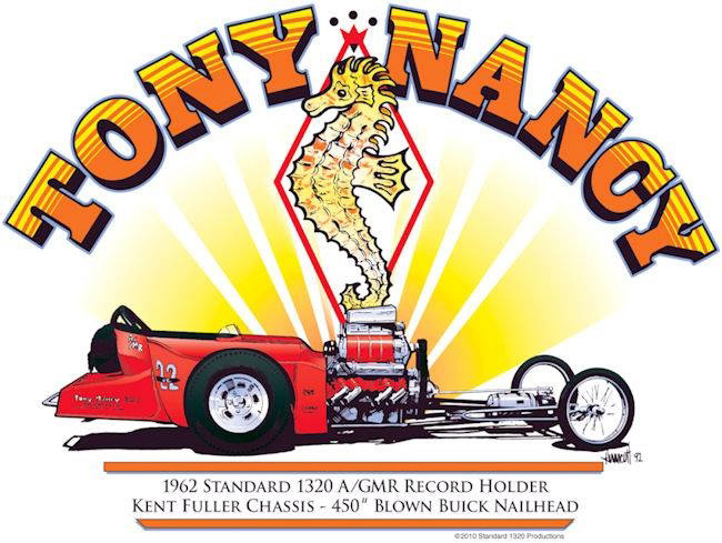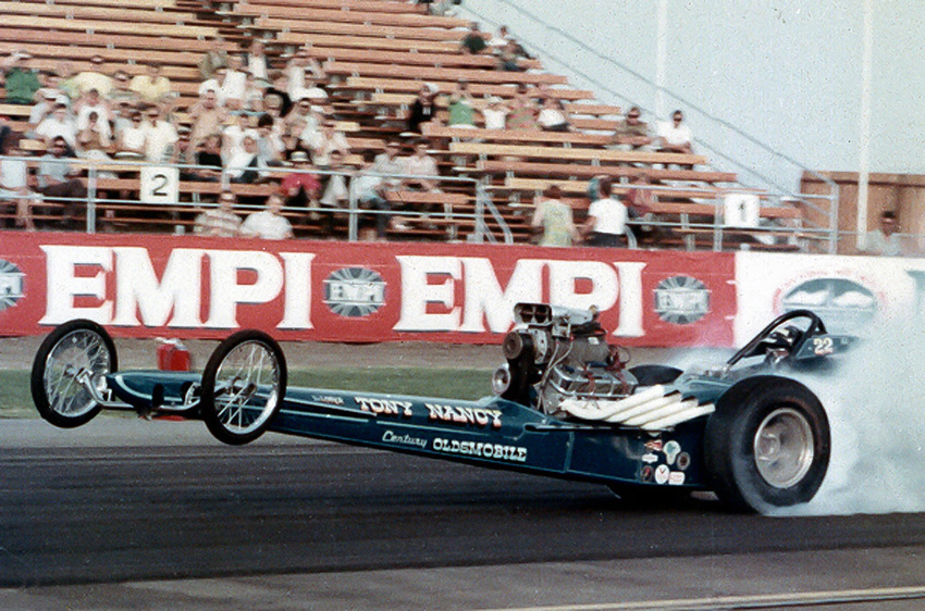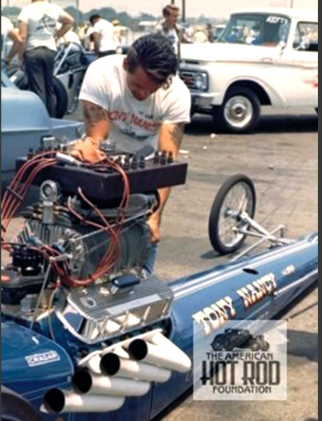 A graduate of Hollywood High School, Tony Nancy began quarter-mile racing after building a rapid rep at El Mirage Dry Lake when he was just a speed-crazy kid. He was a member of the well-known Throttle Merchants Club, in the San Fernando Valley. Always competitive, Tony's best finish was when he won the Competition Eliminator title at the 1963 NHRA Winternationals. That Pomona-winning ride was a blown and injected Plymouth-powered AA/C '23-T Modified roadster. Just as impressively, he also won Best Engineered car at the same event with his first dragster, a Top Gas, wedge-powered digger that helped him hold the Drag News No. 1 spot for nearly a year. How he ever kept his upholstery shop going was a mystery. Ever on the go, Tony drag raced in Australia, Japan and Germany, and was the captain of the U.S. drag racing team that toured Europe in 1964.