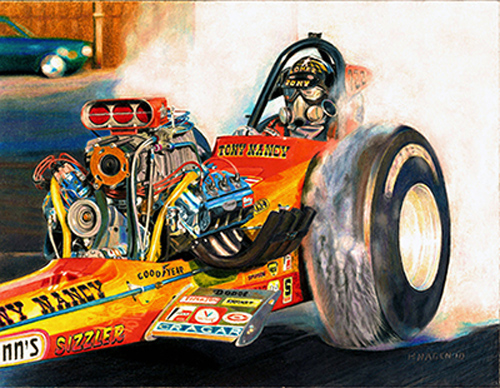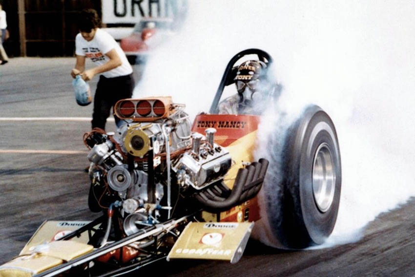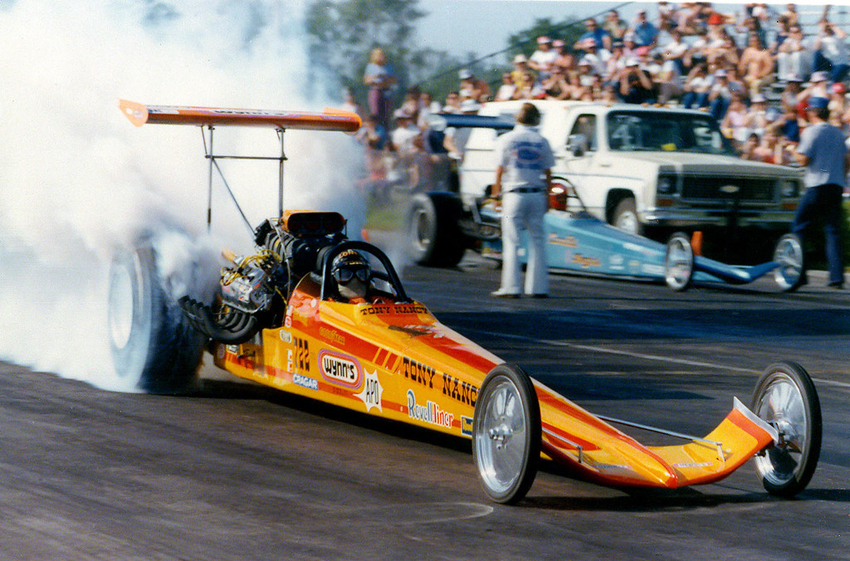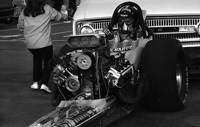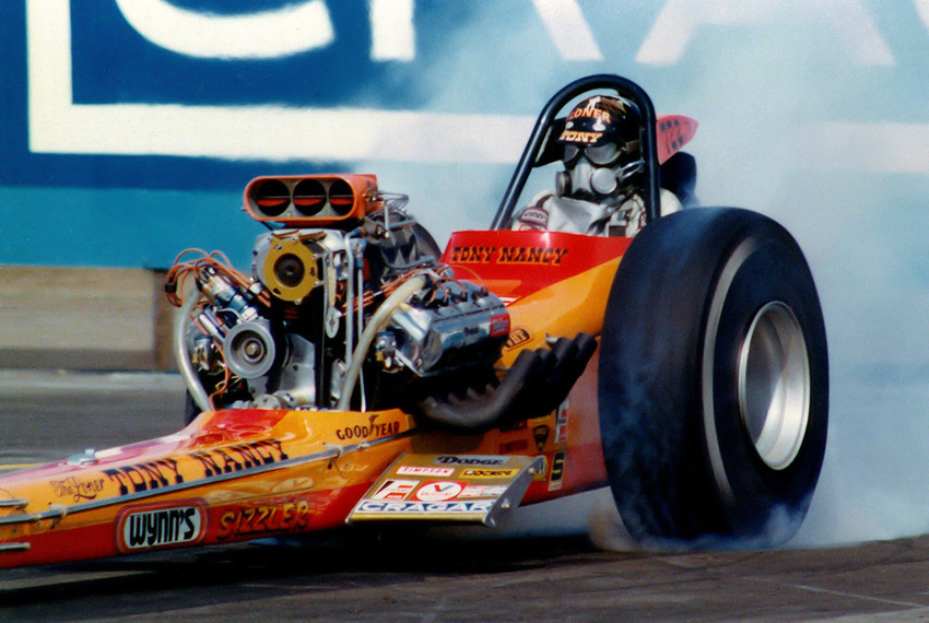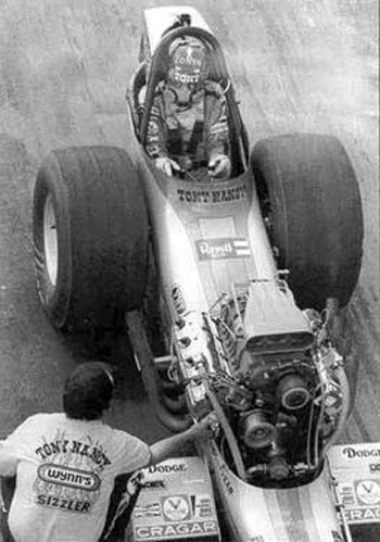 By 1967, Tony's AA/gas dragster had evolved into a rear-engined, blown Olds (sometimes Chevy-powered) hauler that was a frequent winner with a best E.T. of 6.32 seconds at 218.00 mph. Tony entered the Top Fuel ranks in 1970, was runner-up to Larry Dixon at that year's Winternationals, and two months later, he defeated a strong 32-car field to win the Bakersfield U.S. Fuel and Gas Championships, with a 6.75/321.36 pass-the last time anyone did so with a front-engined dragster. Tony was always a popular competitor and a force to be reckoned with, thanks to his own remarkable skills and deep-pocket sponsors like Revell and Wynn's. The runner-up in Bakersfield in 1974 and 1976, he liked to say he'd set at least one record or Drag News 1320 mark in every class in which he competed. Not many people know he was an accomplished stunt driver for the film industry. But why would you be surprised?