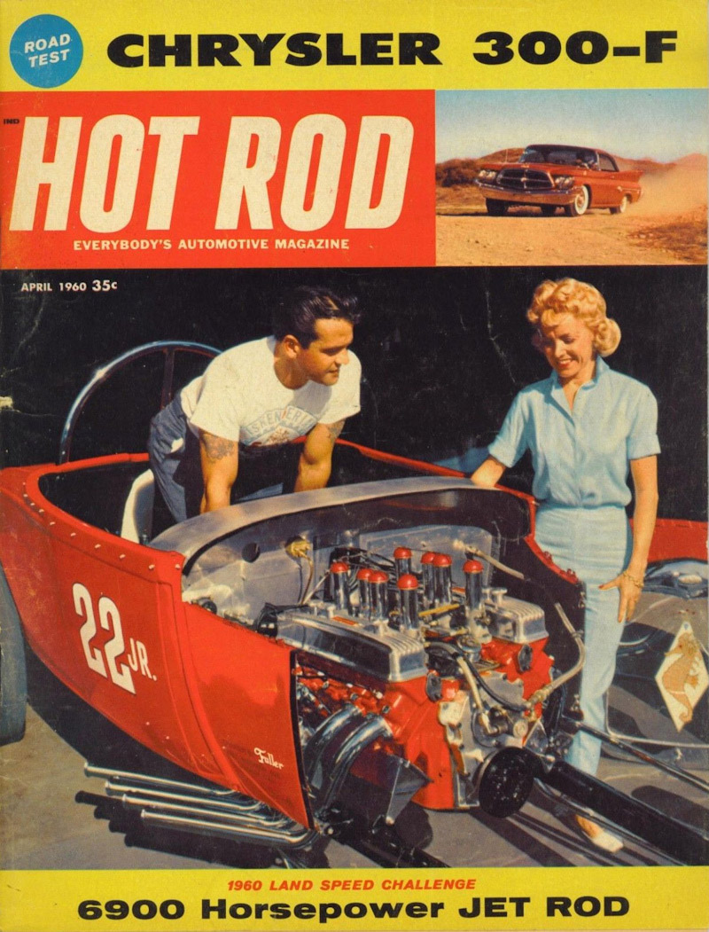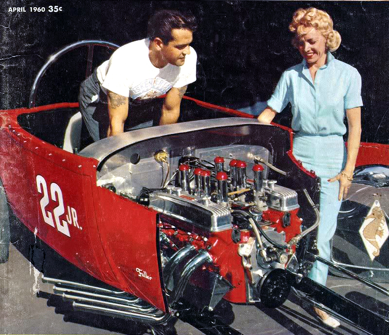 Fast forward to April 1960. Tony's next effort, a featherweight, 1,550-lb. '29 on a Kent Fuller-built tubular frame, with Halibrand wheels, ran a C-T Automotive 4-inch stroked 450-cu.in. Buick nailhead, set back 25 percent of the wheelbase. The stunning, center-steered Buford ran Hilborn fuel injection, a Scintilla Vertex mag and an Isky cam, and started setting records right out of the box. Dzus fasteners permitted quick removal of the complete hood assembly and the cowl, so Tony could tune the motor between runs. He's pictured on a magazine cover, with a good-looking blonde (his wife Lillian). A see-through plexiglass insert in the Model A grille shell sported a prancing seahorse, but there was nothing mincey about this car...or its dedicated driver. (Both 22jr. Roadsters are restored today for all to admire. They're owned by Dan La Croix of North Dighton, Massachusetts).