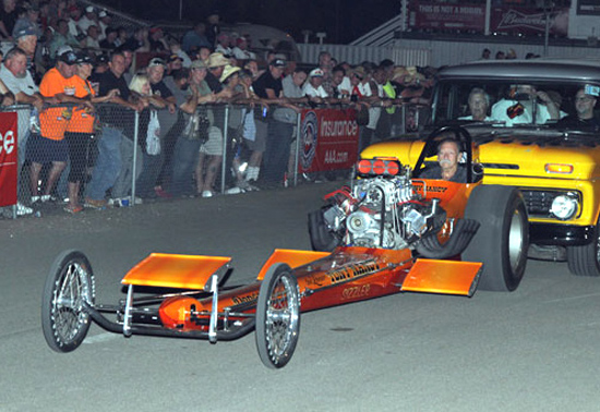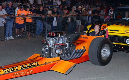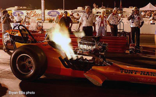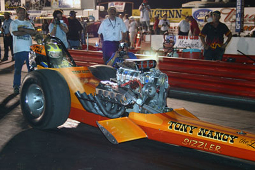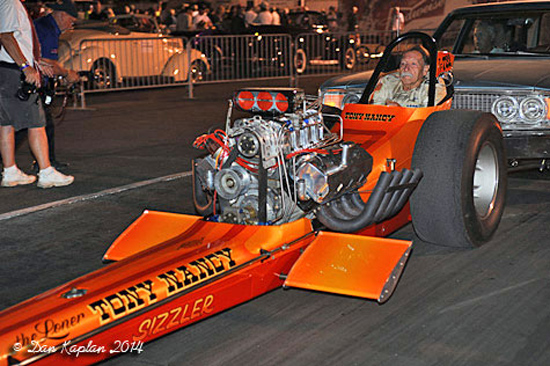 Tony Nancy, whose beautiful cars and famed upholstery work on machines for street and strip made him a revered name in the motorsports world, passed away November 11, 2005 after a long illness. It was a huge loss for friends, family and the sport of drag racing. With the help of Harry Hibler and Bill Carter, one of Tony's last projects came to fruition at the 2003 California Hot Rod Reunion when his immaculately restored first, last and only front engine Top Fuel dragster led the way for Cacklefest IV.