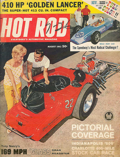 In August 1962, Tony and Lillian were back in the magazines in a feature called "Tony tailors a Tiger." His latest effort was a 169-mph '23 T roadster, with its body set way back on another custom Kent Fuller tube frame. You could see this one coming...with its Lincoln Matador Red finish and striping by the great Dean Jeffries. And you could hear the GMC 6-71-blown, short-stacked, 580-bhp Buick powerplant a mile away. M&H slicks on fat Halibrands in back, with skinny Pirellis on wire wheels in front, helped this quick little scoot resemble a dragster more than a roadster. At 1,340 pounds, it was actually too light for NHRA A/Modified Roadster competition. But that didn't stop Tony.