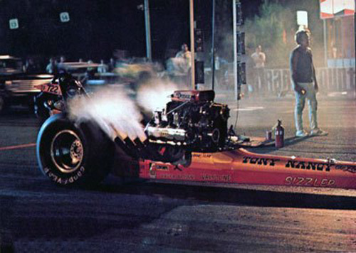 Tony had always dominated the Gas ranks but when NHRA lifted its fuel ban, the public lost interest. Tony said, “Fans jammed the hot dog stands when the call for Top Gas was made.” Deciding he had no choice but to move into fuel, Tony contacted Swaja to design the car, Woody Gilmore to build the chassis and Keith Black the 392-based, de-stroked 389 ci Hemi. As he was no longer racing gas the car was named ‘22 Sr.’ The car was also known as ‘The Sizzler.’Shakedown runs at San Fernando netted a 7.11 ET on the third run—faster than Prudhomme’s track record of 7.17. So far, so good.