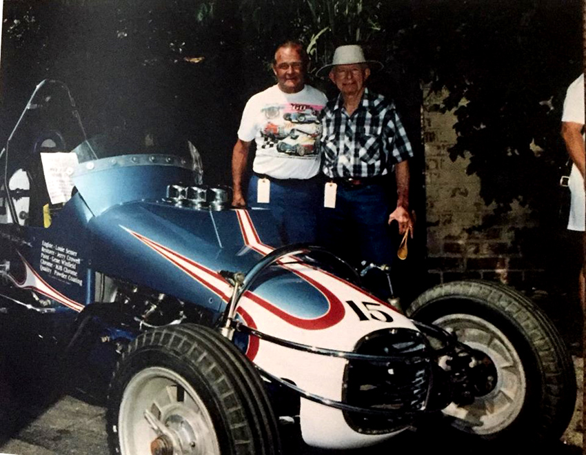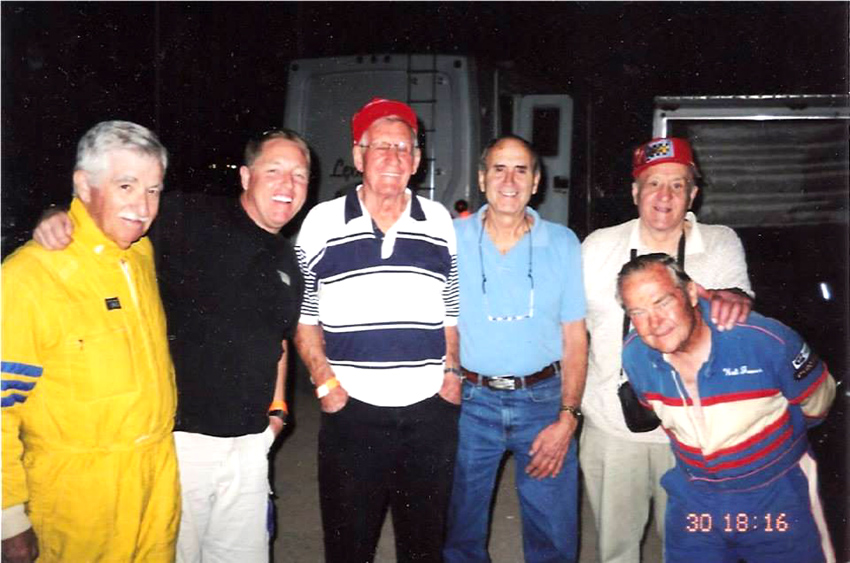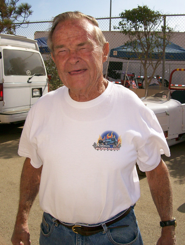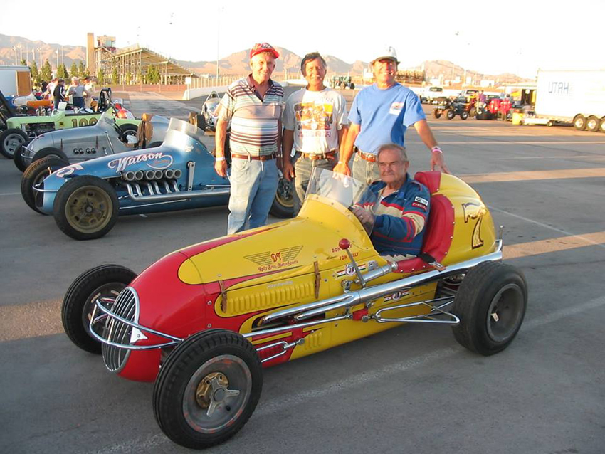 Walt remained in the active Air Force Reserves until retirement as a Lieutenant Colonel- not without some interesting incidents, i.e., being called back in during the late 1950s, but Bombardiers were no longer used and his current job of running a racing association didn't help them at all, so they put him in charge of WAF (Women's Air Force) picnics at March Air Force Base until they could get rid of him which was just in the nick of time as he had a race in Phoenix over the next weekend. Then, while living on a chicken ranch in the city of Winnetka, (in the district of the San Fernando Valley, just north of Los Angeles) he got a call to go to Edwards Air Force Base for a physical, he asked "when", they said "immediately". Off he went thinking he'd be an hour or so and would head back home. When he arrived, they started at his head and by the time they got to his fingernails he was running out of patience - he asked how long this physical was going to take - they said probably a couple weeks. After he caught his breath he started asking questions, seems they were giving him an astronaut physical. Needless to say, he was soon en route home as he was much past the age requirement. After the war Walt got involved with all types of racing including many dry lake runs but mostly at San Bernardino 's "Ash Can Derby" where a 16-year-old named Troy Ruttman was winning everything. Then he joined the newly formed roadster club where he and his brother Joe had to sit out the first race. Seems their Franklin center steering they had been running at San Bernardino was ahead of its time - by the end of the first season CRA was requiring it. In CRA Walt and Joe raced with the likes of future racing heros Troy Ruttman, Andy Linden, Manuel Ayulo, Jack McGrath, Pat Flaherty, the Rathman Bros and many others that went on to national fame. Walt was trying to find his own way to Indianapolis in October 01'1950 with Bud Winfield (of No vi fame) when he, Bud and two other fellows were in an auto accident on the way home from Joe's race at Clovis, CA. Walt says "two fools met at an intersection and I was riding in the back seat with one of them". Unfortunately Winfield was in the front passenger seat and bore the brunt of the collision - he was DOA at the hospital. Walt had been thrown from the car, had both legs crushed at the hips, chest crushed, punctured lungs and head injury. The General Hospital was suggesting amputation of both legs. Joe, whose truck was featured that month in Hot Rod Magazine, had already made it back to Van Nuys before the police could catch up with him and in the meantime Walt was drifting in and out of consciousness and at some point told them he was a veteran and the next thing he remembered he was heading across town in a big shiny limo-like ambulance. Doctors at the Fresno Veterans Hospital were responsible for Walt walking again.