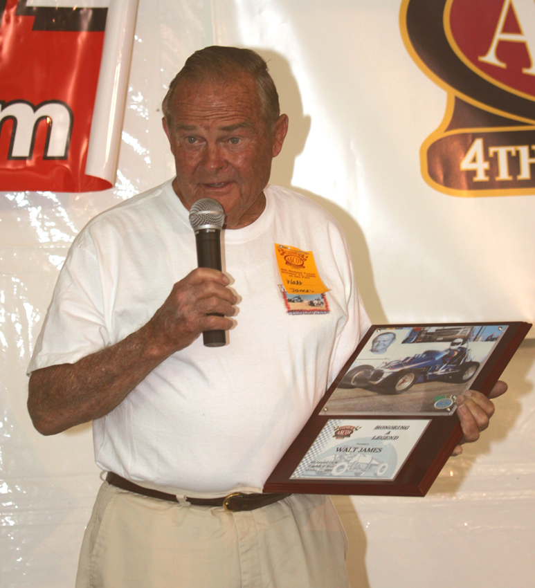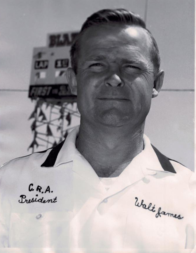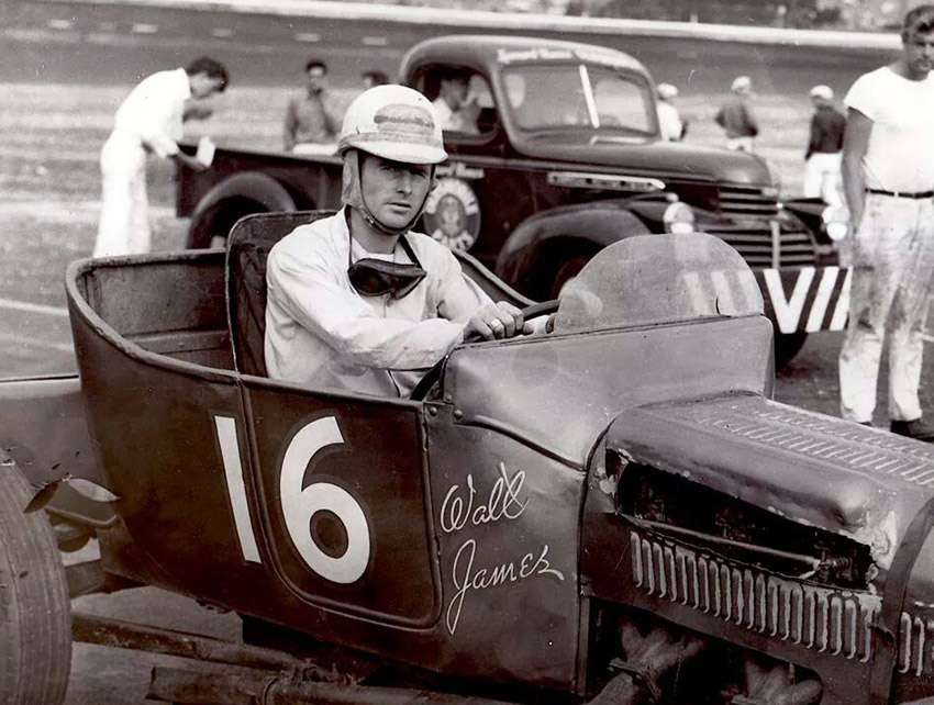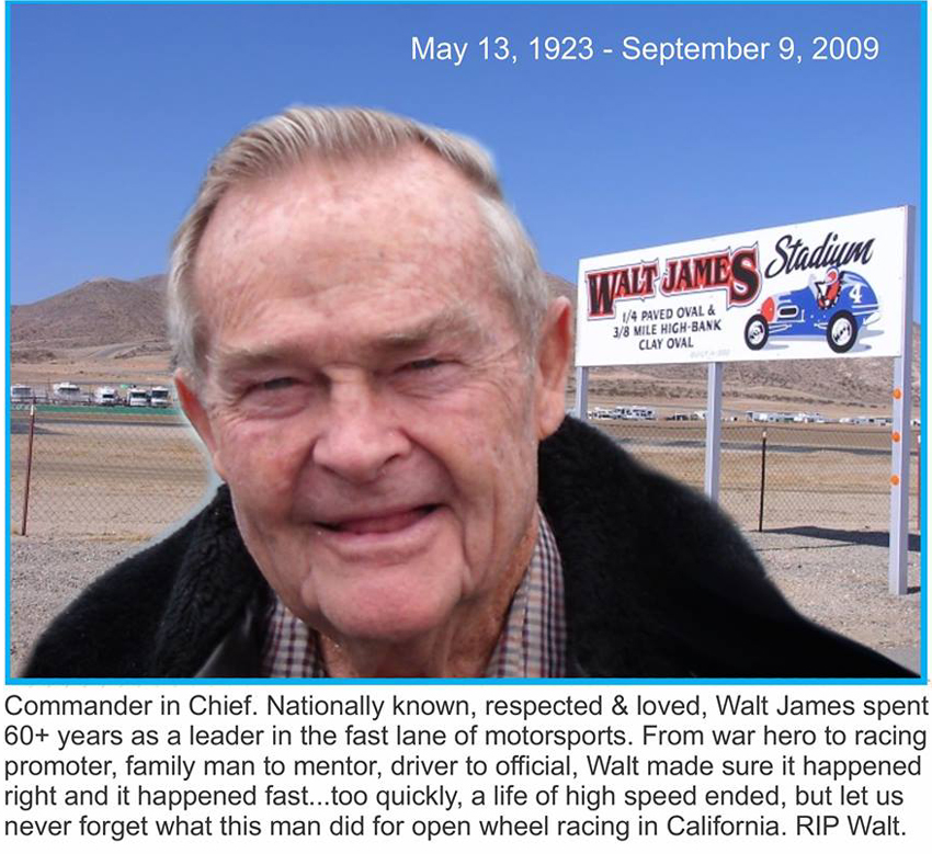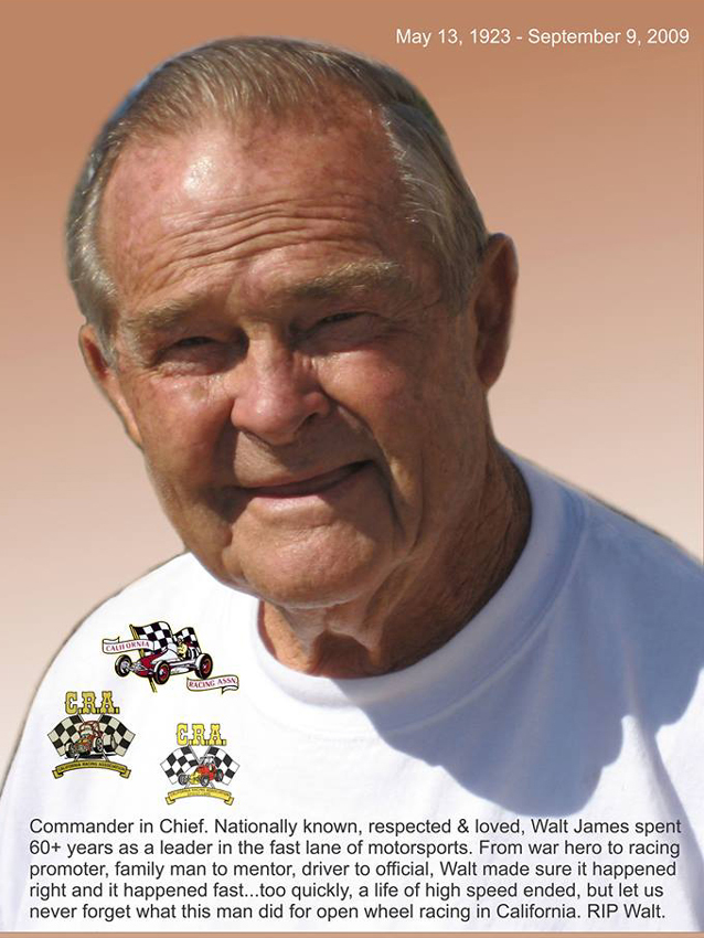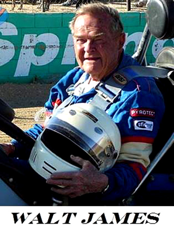 Racing legend Walt James passed away on September 9, 2009, at the age of 86. He was a decorated World War II veteran, flying 26 missions as Lead Bombardier/Navigator, based in England. He served three years active duty and was awarded the Distinguished Flying Cross and the Air Medal of Honor. He remained in the Reserves where he retired in May of 1983 with the rank of Lt.Colonel.