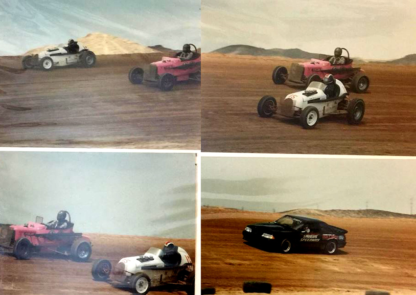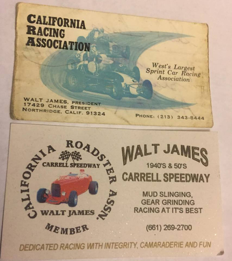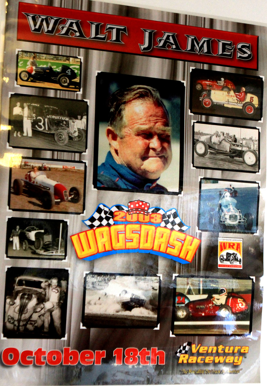 In 1982 Walt and a group of buddies resurrected the Western Racing Assn, a sprint car club that had folded in the mid 50s. It was to be a group of older sprint cars and midgets to show off the ingenuity of the early days of racing or, as he liked to say, the Senile Racing Group. He’d say, “We’re just a bunch of old blind guys who still love to go fast.” Also about 1981, Bill Huth owner of the Willow Springs Raceway, encouraged Walt to build a track for WRA and in 1982 the track was open for business. A very surprised Walt got to the track to find it had been named WALT JAMES STADIUM. Every year since on Thanksgiving weekend Walt and Dottie have hosted the WALT JAMES VINTAGE GATHERING. Bill Huth has said he will still have the 17th annual Walt James racing weekend this Thanksgiving.