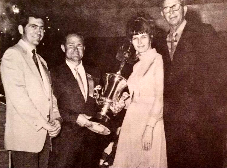 Walt with a tiny trophy and a lady in Fresno 1952
