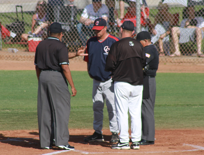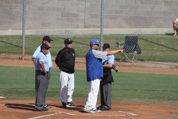 The coaches and umps meet before the game to share line-ups and talk of any ground rules that need to be covered.