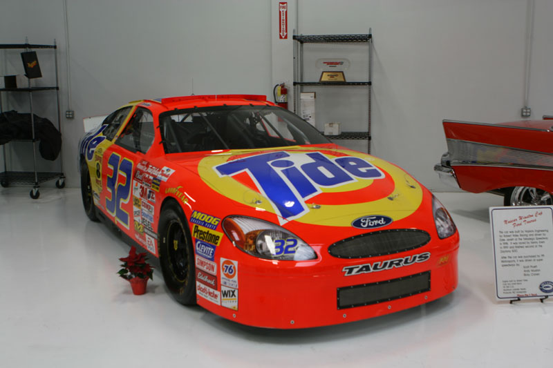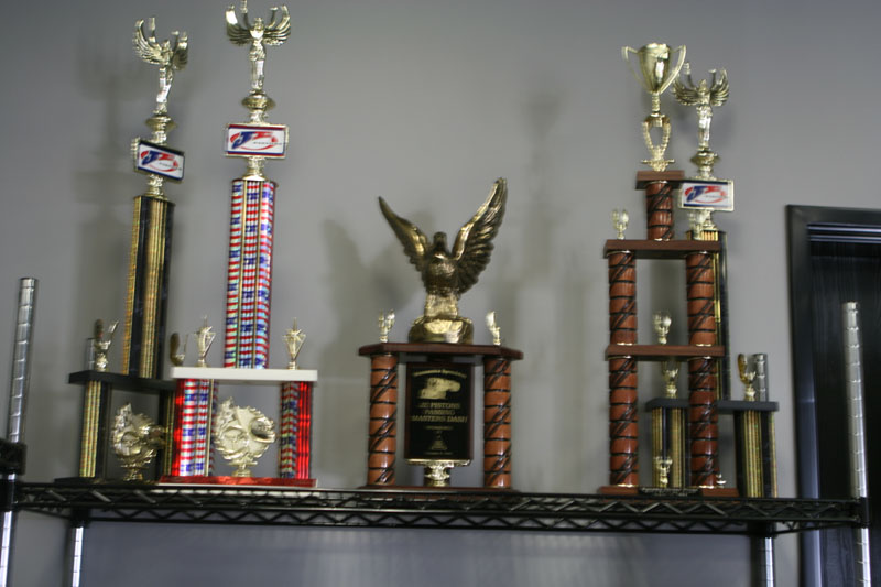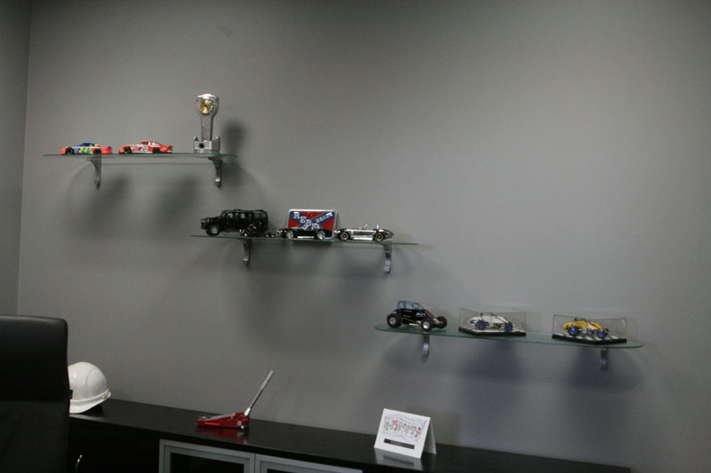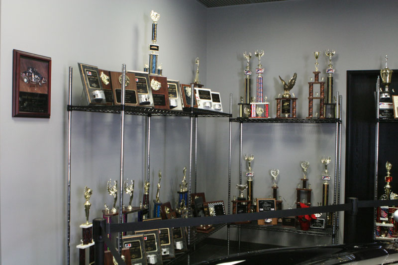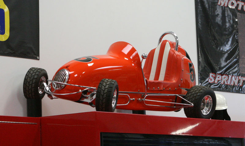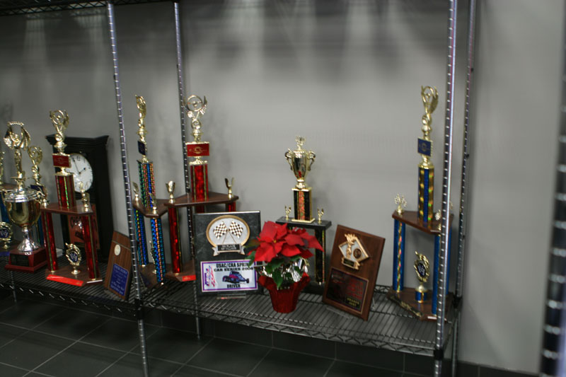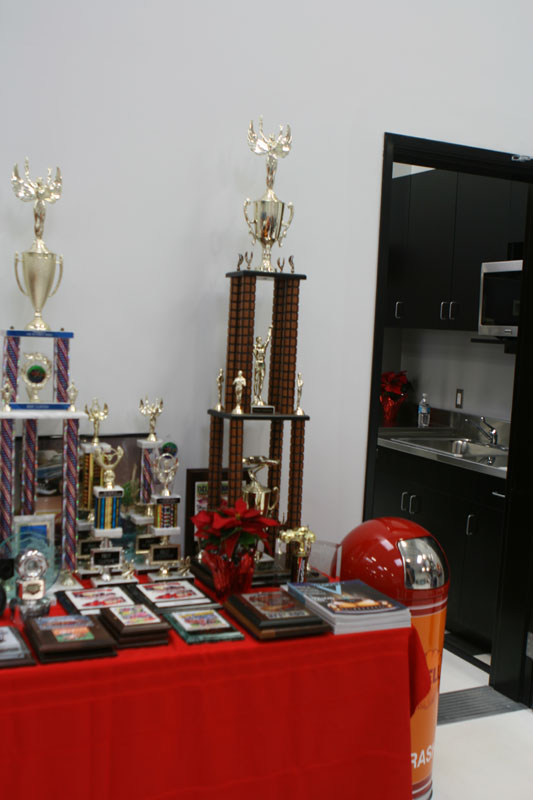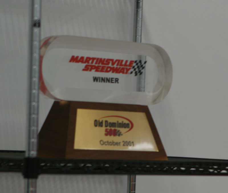 The "other" shop was really a showroom as numerous cars were on display. An old panel truck sharply painted and lettered, a stock car driven in NASCAR, a knockout custom Mercury, an old Indian motorcycle, a couple of Model A's and a red 57 chevy I would be proud to own. The pics below will give you a better view, but there were some hot items on display in this room that had a small sign above saying “big boys toys”. Another trophy area next to the connecting door had more hardware on display. I didn't see a cot, but I could imagine some all nighters in the race shop during the season when things needed adjustments.