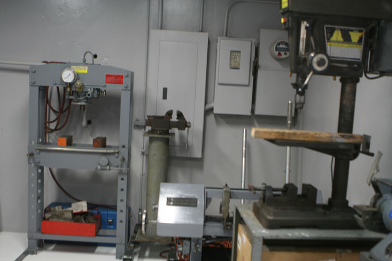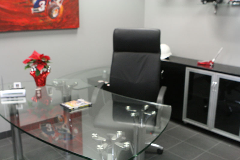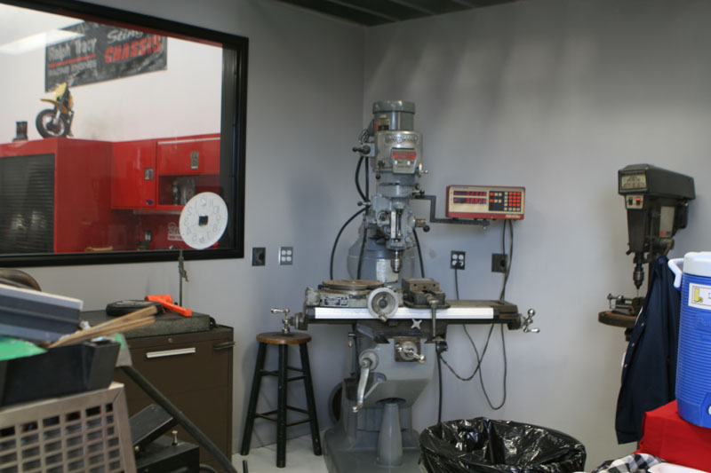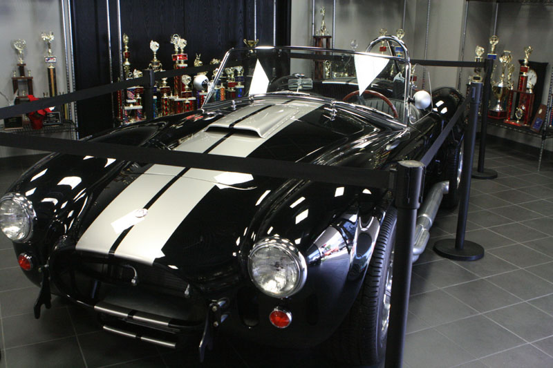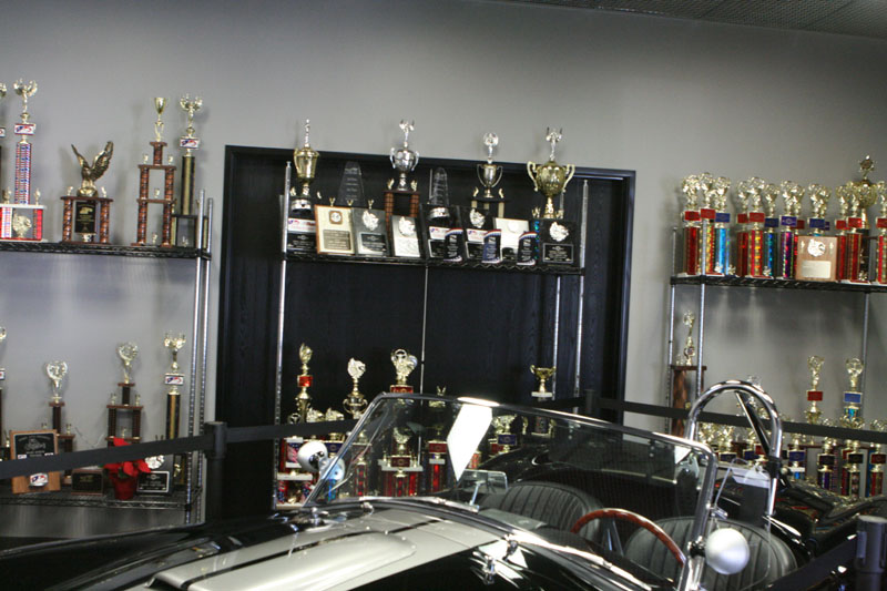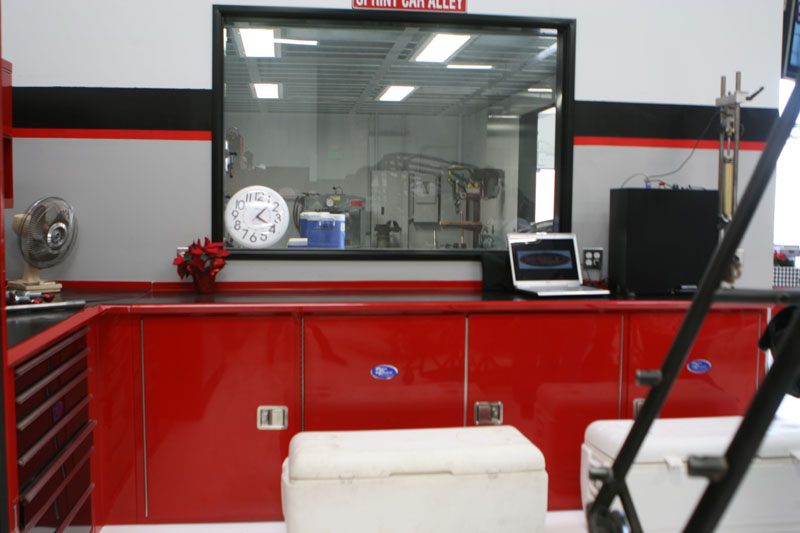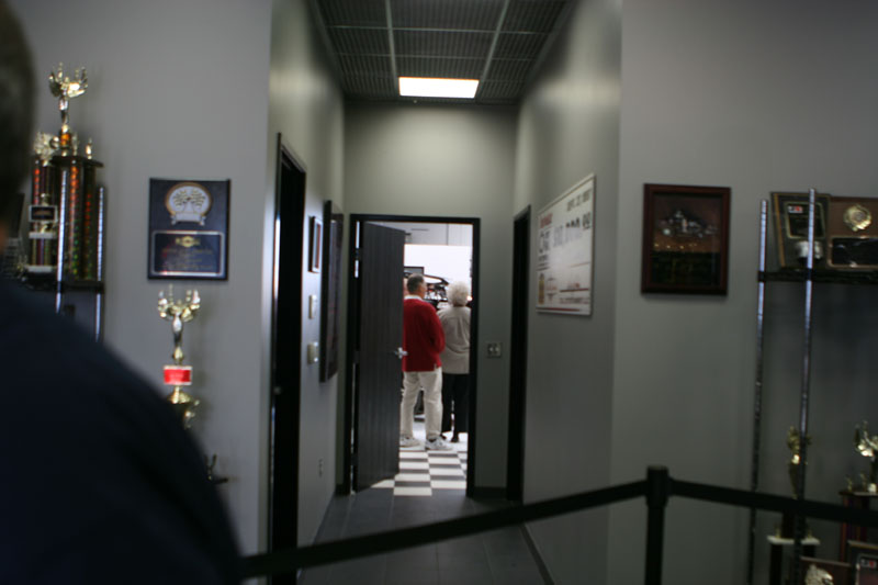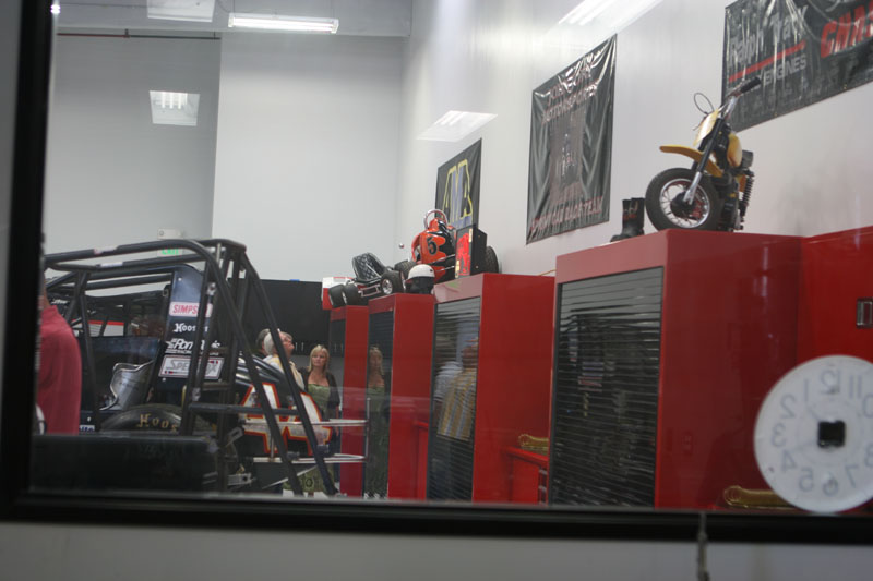 The shop actually is two separate shops, side by side with a door entry between them, probably 50 feet wide and some 150 feet long each. Both have small office areas up front with the race shop side office having nothing but trophies and one black and silver show stopping Ford Cobra. That "trophy room" entrance is pretty impressive with all the earned hardware on display. A small office looked like it was Jacks relaxing room when he was in house, and had a glass window view of the race shop. Both ends of the race shop had overhead doors that allowed the team's massive black hauler to pull inside for easy load and unload. Going into the shop from the trophy room you can see the left side consists of multiple "bays" with professional tool storage all along the wall of that area. The right side is covered with sharp looking diamond plate and mounted on it were various pictures of the team memories. Above that were some old chassis and other storage items. A small machine room, about 15 foot square, houses different machines for making and mending parts and stuff.