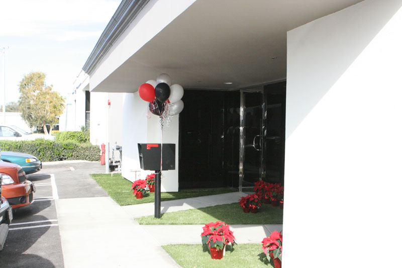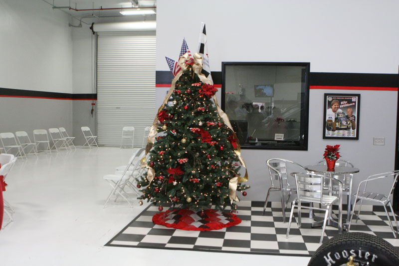 A christmas tree in front of Jacks office. The overhead door lets the hauler in.