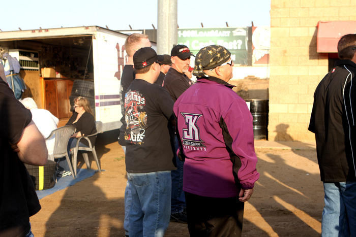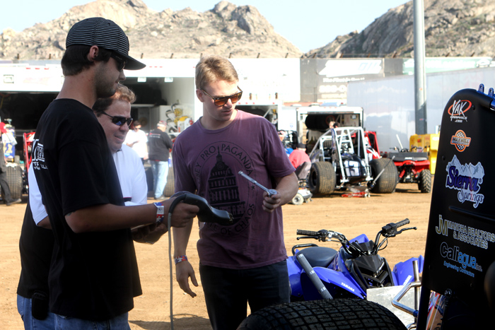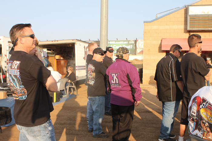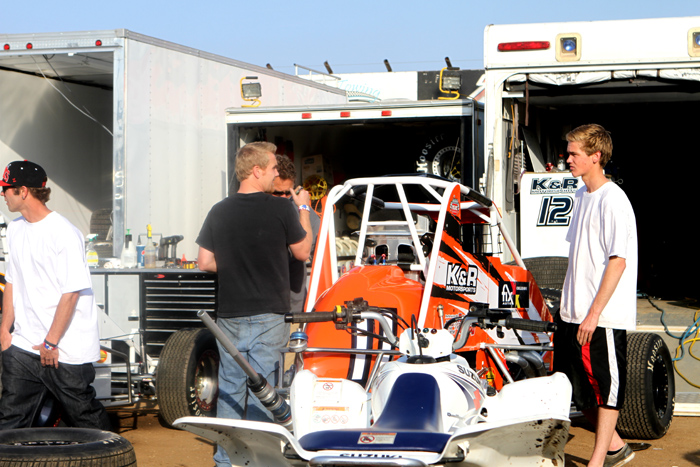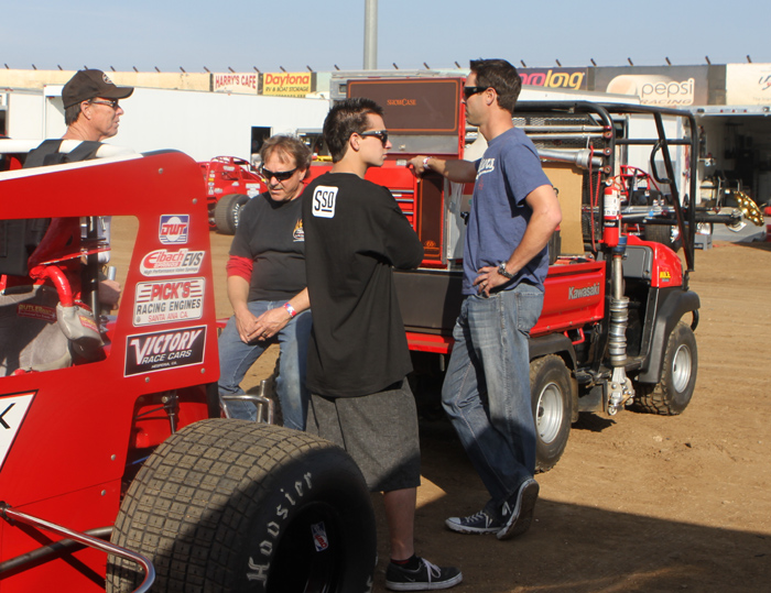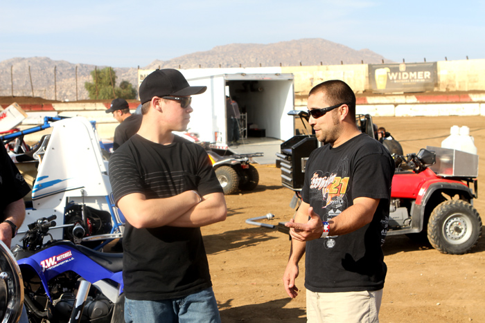 Rookie Ryan Bernal, left, visits with Casey Shuman in the pits.