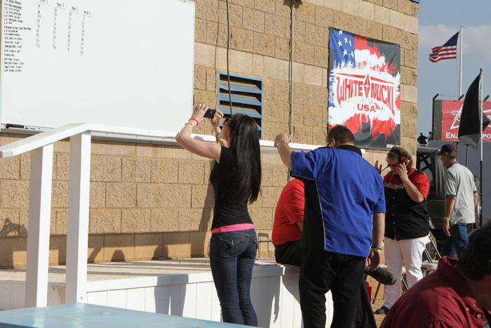 Damion Gardner and Julie Shiosaki listen at the pit meeting.