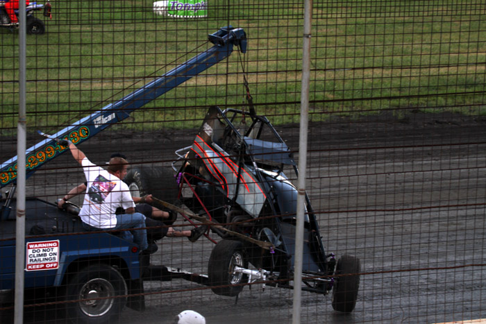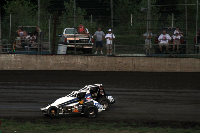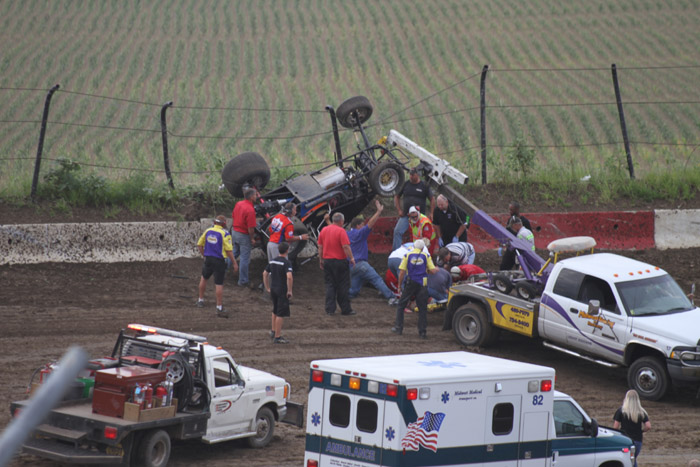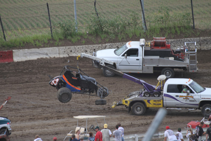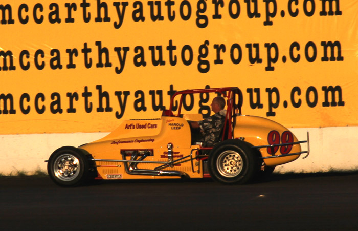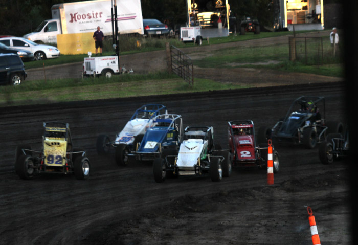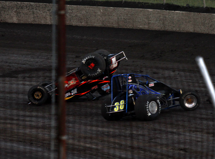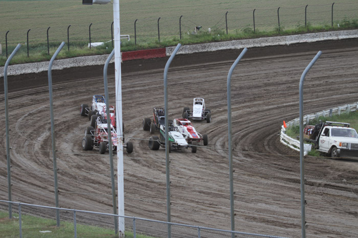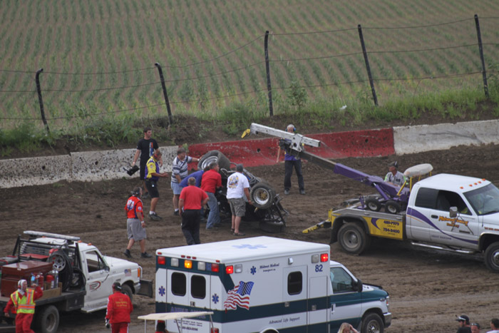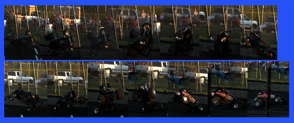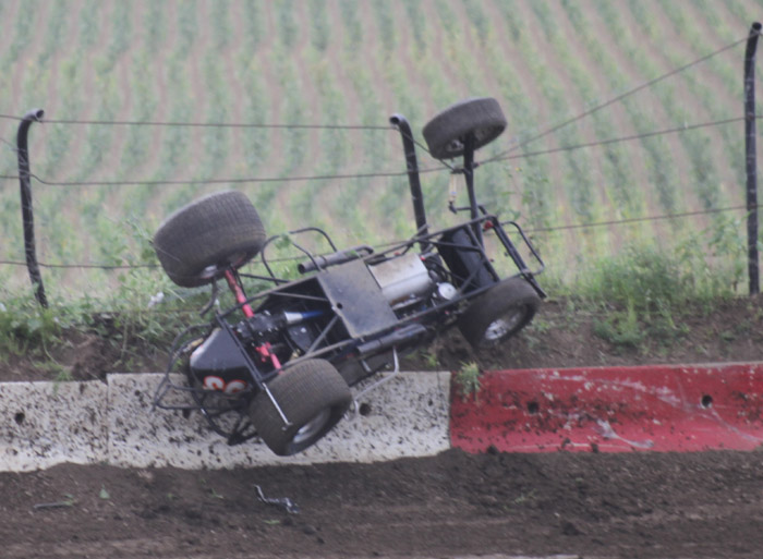 This was the first heat in what should have been the start of a good race. That black car with the orange strip ends up in the wall and Jack Dover went to the hospital where he was still in intensive care a few days later.