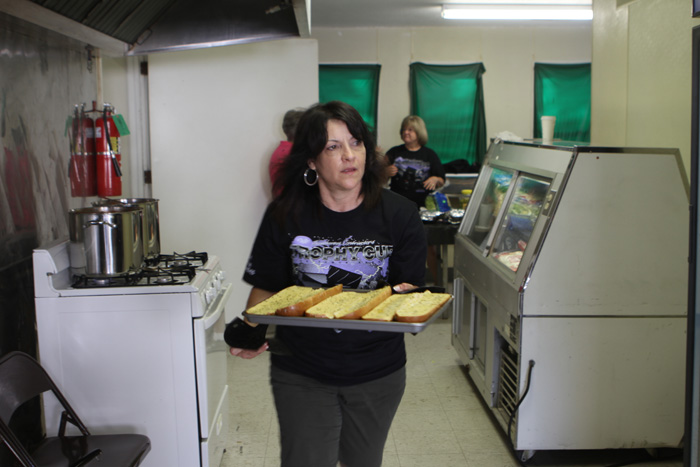 Trophy Dave's daughter Karen gets the bread warmed up.