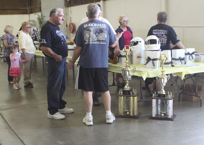 Trophy Dave greets the fans near the auction items table. The two winner trophies for the night are on the floor.